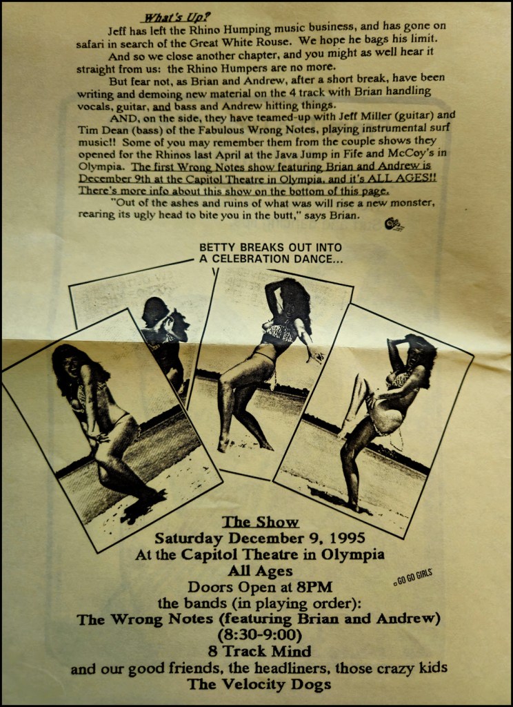 Brian and I had many more musical adventures after the Wrong Notes, including two Rhino Humpers reunions in August and December 1997 (the latter including Jeff, both including Vince), playing gigs together where we were in the same bands as well as a couple gigs where we shared the bill in different bands. We even had a couple reunions in the summer of 2024, 30 years after I joined the band, to jam out some Rhino Humpers classics in a stinky Seattle rehearsal studio.