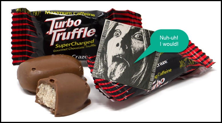 Caffeine and chocolate mixed, they were a great pick me up if you had one, but would quickly become a “please make it stop and put me back down right now before I FREAK THE FUCK OUT!!” if you had three or four. Ask me how I know!