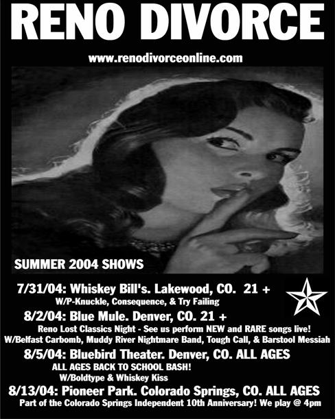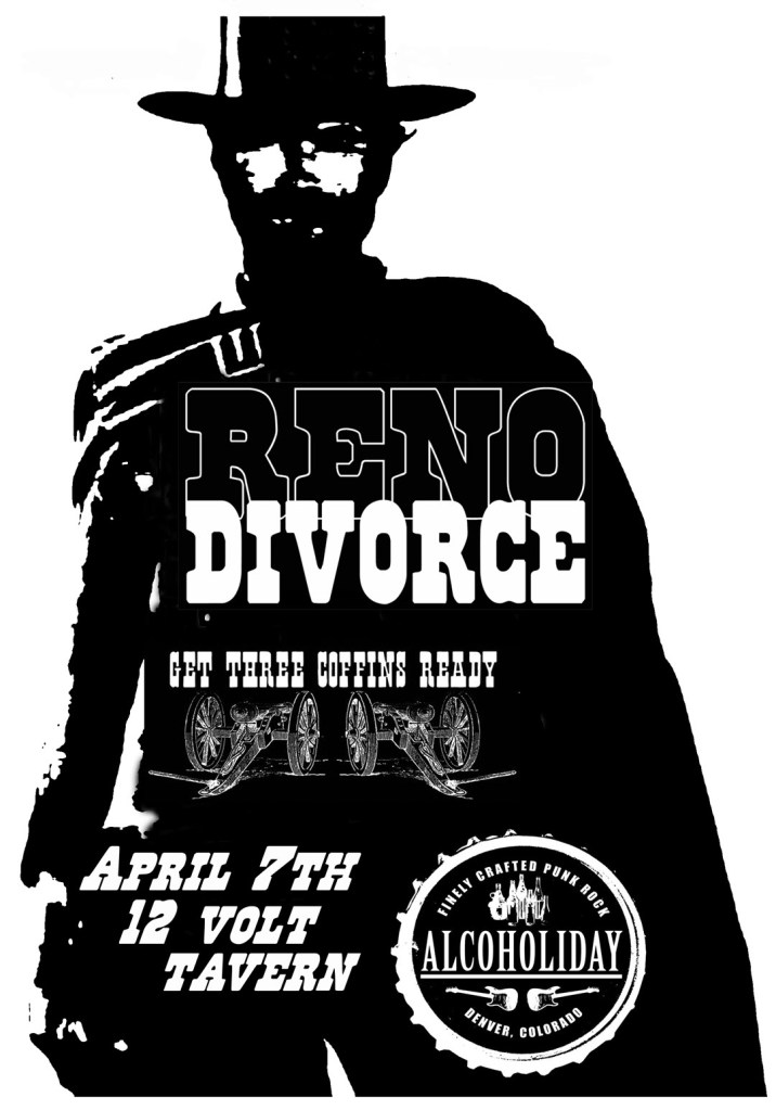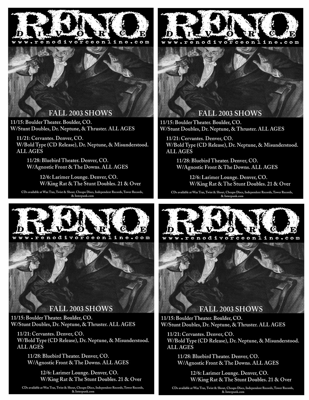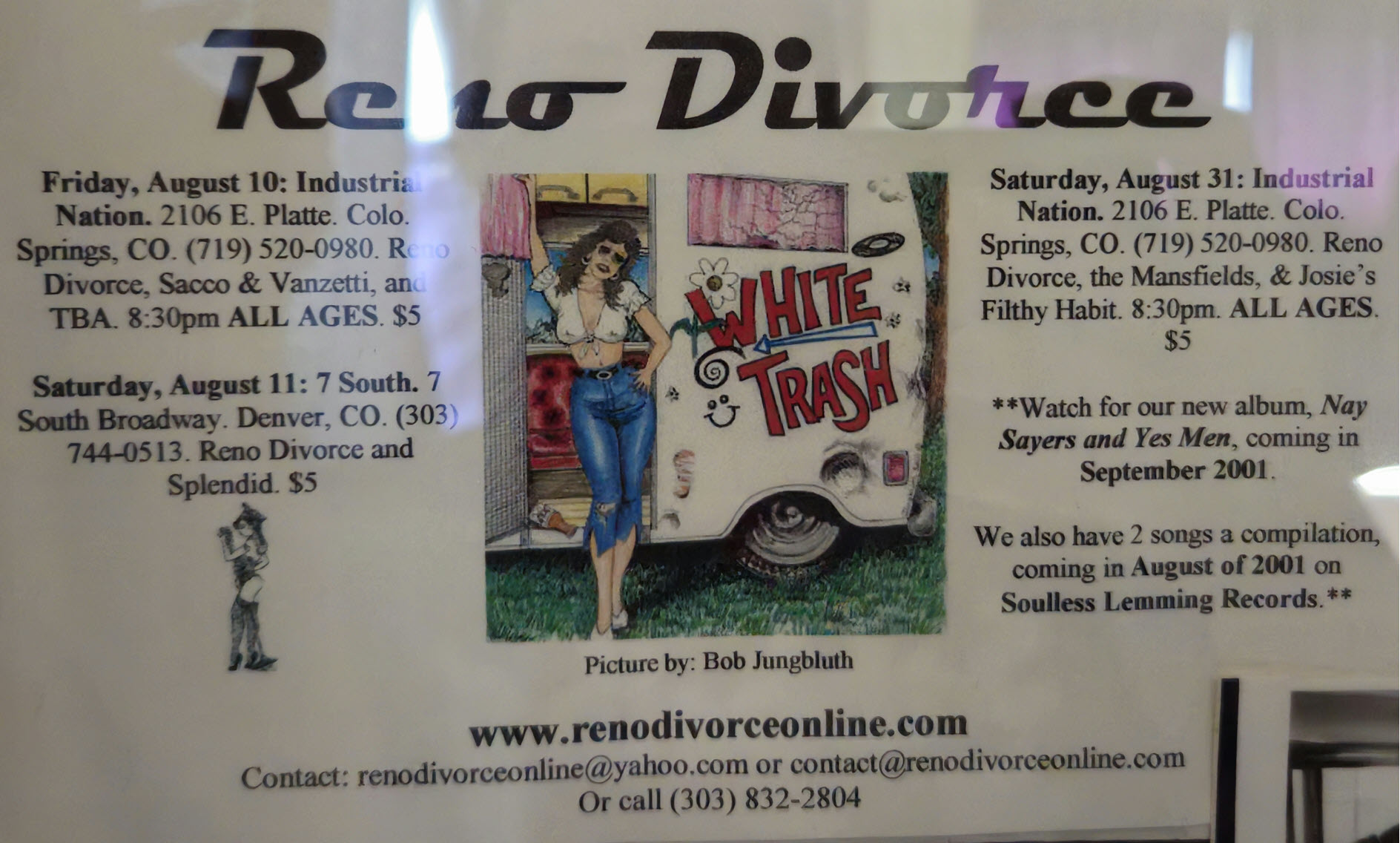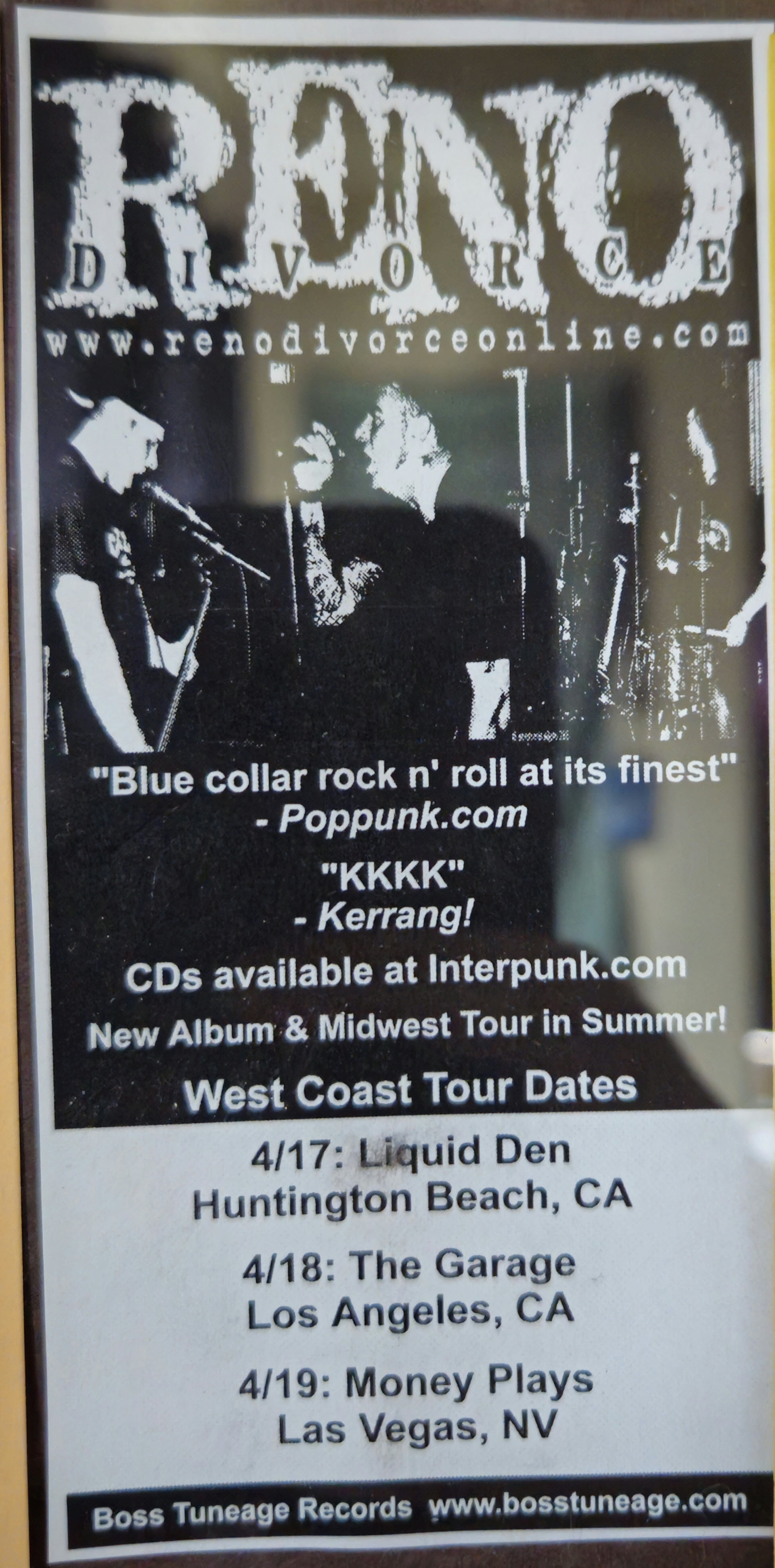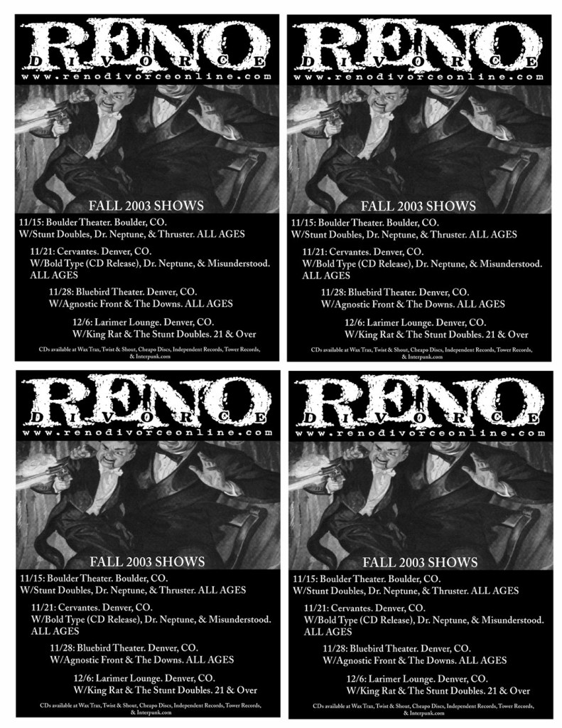 11/4 and both 11/20 shows were canceled.Reno Divorce | Cavern Club | Exeter, UK | 11/14/2004Reno Divorce | Naysayers and Yesmen/Laugh Now Cry Later 2005 advertisementReno Divorce | Bender’s Tavern | Denver, CO | 3/28/2005Reno Divorce | Spring 2005 TourReno Divorce | Spring 2005 TourReno Divorce | 2005 Tour PosterReno Divorce | Naysayers and Yesmen/Laugh Now Cry Later 2005 MySpace handbillsReno Divorce | Striker’s Bar | Superior, WI | 6/11/2005Reno Divorce | Gothic Theater | Denver, CO | 10/28/2005Reno Divorce | Lion’s Lair | Denver, CO | 11/19/2005Reno Divorce | Grindwell Skate Park | Castle Rock, CO | 11/26/2005Reno Divorce | Cricket on the Hill | Denver, CO | 12/3/2005Reno Divorce | December 2005 shows with Agent Orange and the BlastersReno Divorce | Bluebird Theater | Denver, CO | 12/18/2005Reno Divorce | Naysayers and Yesmen/Laugh Now Cry Later 2006 advertisementReno Divorce | 2006 Tour PosterReno Divorce | Spring 2006 TourReno Divorce | Double Down Saloon | Las Vegas, NV | 3/25/2006Reno Divorce | Bluebird Theater | Denver, CO | 7/16/2006Reno Divorce | Palace Ballroom | Colorado Springs, CO | 10/13/2006Reno Divorce | Bender’s Tavern | Denver, CO | 10/20/2006Reno Divorce | 3 Kings | Denver, CO | 11/22/2006Reno Divorce | 3 Kings Tavern | Denver, CO | 1/6/2007Reno Divorce | Marquis Theater | Denver, CO | 1/20/2007Reno Divorce | Cricket on the Hill | Denver, CO | 2/10/2007Reno Divorce | Bender’s Tavern | Denver, CO | 2/18/2007Reno Divorce | 3 Kings Tavern | Denver, CO | 3/8/2007Reno Divorce | Triple Nickel Tavern | Colorado Springs, CO | 3/9/2007Reno Divorce | 12 Volt Tavern | Arvada, CO | 4/7/2007Reno Divorce | Pasquini’s | Denver, CO | 4/27/2007Reno Divorce | 15th St Tavern | Denver, CO | 5/19/2007Reno Divorce | Marquis Theater | Denver, CO | 6/29/2007Reno Divorce | Summer 2007 Tour Reno Divorce | Poster for collaboration with Tattooed Lady clothing | 2007Reno Divorce autographed 8×10 | 2007Reno Divorce | Rocket Room | Colorado Springs, CO | 8/10/2007Reno Divorce | Spotlight Lounge | Grand Junction, CO | 8/11/2007Reno Divorce | Walnut Room | Denver, CO | 8/17/2007Reno Divorce | 12 Volt Tavern | Arvada, CO | 10/26/2007Reno Divorce | Spotlight Lounge | Grand Junction, CO | 10/27/2007Reno Divorce | Bender’s Tavern | Denver, CO | 11/3/2007Reno Divorce | 3 Kings | Denver, CO | 12/21/2007Reno Divorce | Marquis Theater | Denver, CO | 1/19/2008Reno Divorce | February 2008 showsReno Divorce | Bender’s Tavern | Denver, CO | 2/16/2008Reno Divorce | Club Inferno | Denver, CO | 2/29/2008Reno Divorce | Old Curtis Street Pub | Denver, CO | 3/10/2008Reno Divorce | Marquis Theater | Denver, CO | 3/22/2008Reno Divorce | Marquis Theater | Denver, CO | 3/22/2008Reno Divorce | Private Party | Denver, CO | 4/5/2008Reno Divorce | The Black Sheep | Colorado Springs, CO | 5/17/2008Reno Divorce | Spring 2008 TourReno Divorce | 2008 Tour PosterReno Divorce | Kenny B’s | Manitowoc, WI | 5/31/2008Reno Divorce | Bender’s Tavern | Denver, CO | 6/20/2008Reno Divorce | Summer 2008 showsReno Divorce | 3 Kings Tavern | Denver, CO | 8/4/2008Reno Divorce | Ogden Theater | Denver, CO | 1/30/2009Reno Divorce | 3 Kings Tavern | Denver, CO | 2/7/2009Reno Divorce | Sidepocket Lounge | Kilgore, TX | 2/20/2009Reno Divorce | Texas Hotrod Hoedown | New Caney, TX | 2/21/2009Reno Divorce | Bluebird Theater | Denver, CO | 3/13/2009The Mansfields | Tonic | Reno, NV | 3/14/2009 Reno Divorce | Bender’s Tavern | Denver, CO | 4/17/2009Reno Divorce | Bender’s Tavern | Denver, CO | 4/17/2009Reno Divorce | Bluebird Theater | Denver, CO | 5/2/2009Reno Divorce | 3 Kings | Denver, CO | 5/20/2009Reno Divorce | Celtic House Pub | Parker, CO | 5/23/2009Reno Divorce | Westword Music Showcase | Bannock Street Garage | Denver, CO | 6/13/2009Reno Divorce | Marquis Theater | Denver, CO | 6/26/2009Reno Divorce | Marquis Theater | Denver, CO | 6/26/2009Reno Divorce | European Tour Poster | July 2009Reno Divorce | I Scream Records poster for Tears Before Breakfast and Summer 2009 European TourReno Divorce | Club Bogaloo | Pfarrkirchen, GERMANY | 7/10/2009Reno Divorce | Sjock Festival | Gierle, BELGIUM | 7/11/2009Reno Divorce | Trix | Antwerp, BELGIUM | 7/12/2009Reno Divorce | Walfisch | Freiburg, GERMANY | 7/14/2009 Schedule lists old date of 8/8, before show was moved to 7/14Reno Divorce | Herman’s Hideaway | Denver, CO | 9/18/2009Reno Divorce | Herman’s Hideaway | Denver, CO | 9/18/2009Reno Divorce | European Tour Poster | November & December 2009Reno Divorce | Archiv | Potsdam, GERMANY | 11/21/2009Reno Divorce | Dekompresja | Lodz, POLAND | 11/22/2009Reno Divorce | Ucho | Gdynia, POLAND | 11/23/2009Reno Divorce | Viper Room | Vienna, AUSTRIA | 11/25/2009Reno Divorce | Speedfest | Eindhoven, NETHERLANDS | 11/28/2009Reno Divorce | Kato Club | Berlin, GERMANY | 11/30/2009Reno Divorce | City Invasion | Sheffield & London, UK| 12/5 & 12/6/2009Reno Divorce | AZ | Aachen, GERMANY | 12/7/2009Reno Divorce | Az | Aachen, GERMANY | 12/7/2009Reno Divorce | Ogden Theater | Denver, CO | 1/14/2010Reno Divorce | Marquis Theater | Denver, CO | 2/6/2010Reno Divorce | Herman’s Hideaway | Denver, CO | 2/20/2010Reno Divorce | Herman’s Hideaway | Denver, CO | 2/20/2010Reno Divorce | Texas Hotrod Hoedown | New Caney, TX | 2/27/2010To The Glorious Lonely | Fuel | Seattle, WA | 4/10/2010 | Reunited onstage with Jeff Rouse of Rhino Humpers.Third Law of Motion | Fuel | Seattle, WA | 5/27/2011Third Law of Motion Setlist | 2011Third Law of Motion | Backstage Bar and Grill | Tacoma, WA | 3/17/2012 | To date, my last time playing drums on stage.