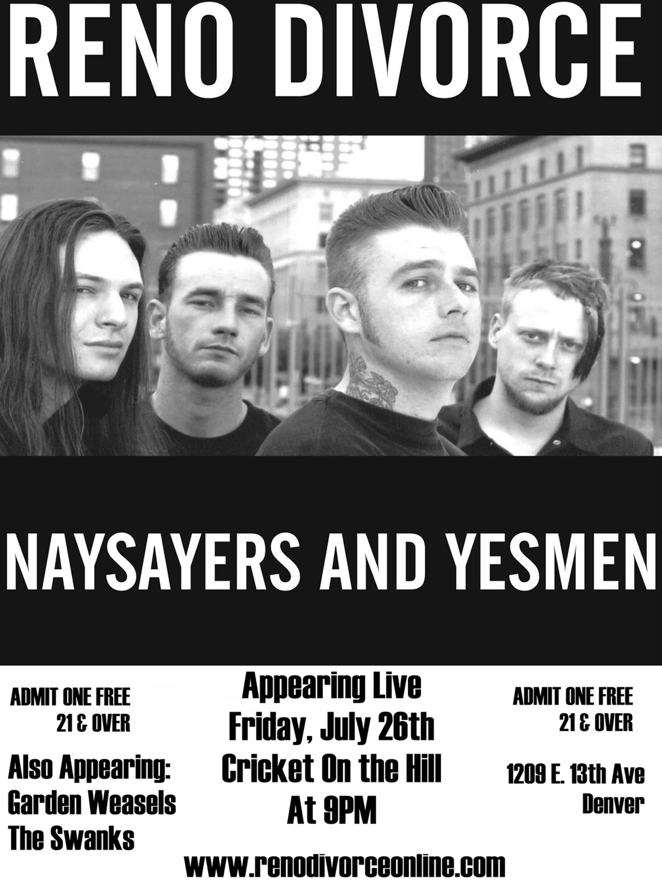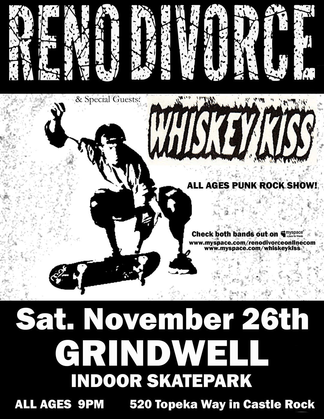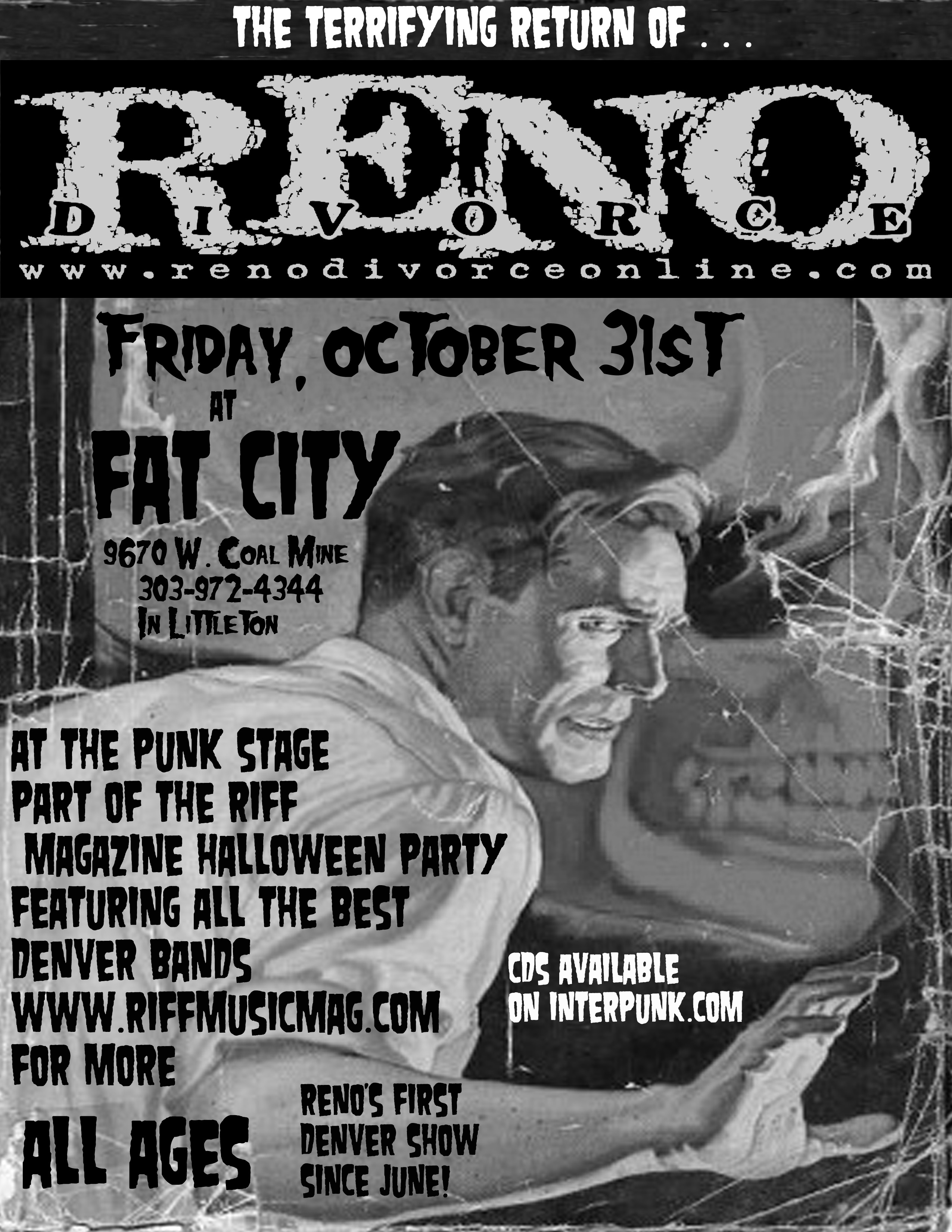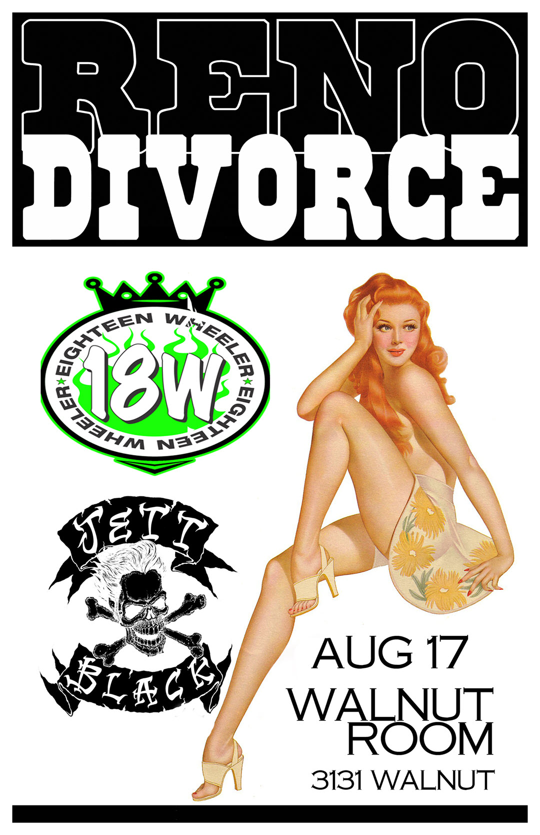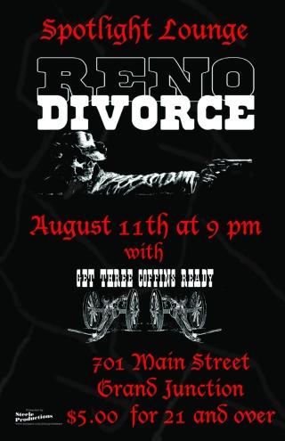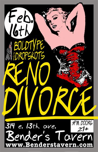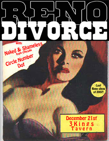 11/4 and both 11/20 shows were canceled.Reno Divorce | Cavern Club | Exeter, UK | 11/14/2004Reno Divorce | Naysayers and Yesmen/Laugh Now Cry Later 2005 advertisementReno Divorce | Bender’s Tavern | Denver, CO | 3/28/2005Reno Divorce | Spring 2005 TourReno Divorce | Spring 2005 TourReno Divorce | 2005 Tour PosterReno Divorce | Naysayers and Yesmen/Laugh Now Cry Later 2005 MySpace handbillsReno Divorce | Striker’s Bar | Superior, WI | 6/11/2005Reno Divorce | Gothic Theater | Denver, CO | 10/28/2005Reno Divorce | Lion’s Lair | Denver, CO | 11/19/2005Reno Divorce | Grindwell Skate Park | Castle Rock, CO | 11/26/2005Reno Divorce | Cricket on the Hill | Denver, CO | 12/3/2005Reno Divorce | December 2005 shows with Agent Orange and the BlastersReno Divorce | Bluebird Theater | Denver, CO | 12/18/2005Reno Divorce | Naysayers and Yesmen/Laugh Now Cry Later 2006 advertisementReno Divorce | 2006 Tour PosterReno Divorce | Spring 2006 TourReno Divorce | Double Down Saloon | Las Vegas, NV | 3/25/2006Reno Divorce | Bluebird Theater | Denver, CO | 7/16/2006Reno Divorce | Palace Ballroom | Colorado Springs, CO | 10/13/2006Reno Divorce | Bender’s Tavern | Denver, CO | 10/20/2006Reno Divorce | 3 Kings | Denver, CO | 11/22/2006Reno Divorce | 3 Kings Tavern | Denver, CO | 1/6/2007Reno Divorce | Marquis Theater | Denver, CO | 1/20/2007Reno Divorce | Cricket on the Hill | Denver, CO | 2/10/2007Reno Divorce | Bender’s Tavern | Denver, CO | 2/18/2007Reno Divorce | 3 Kings Tavern | Denver, CO | 3/8/2007Reno Divorce | Triple Nickel Tavern | Colorado Springs, CO | 3/9/2007Reno Divorce | 12 Volt Tavern | Arvada, CO | 4/7/2007Reno Divorce | Pasquini’s | Denver, CO | 4/27/2007Reno Divorce | 15th St Tavern | Denver, CO | 5/19/2007Reno Divorce | Marquis Theater | Denver, CO | 6/29/2007Reno Divorce | Summer 2007 Tour Reno Divorce | Poster for collaboration with Tattooed Lady clothing | 2007Reno Divorce autographed 8×10 | 2007Reno Divorce | Rocket Room | Colorado Springs, CO | 8/10/2007Reno Divorce | Spotlight Lounge | Grand Junction, CO | 8/11/2007Reno Divorce | Walnut Room | Denver, CO | 8/17/2007Reno Divorce | 12 Volt Tavern | Arvada, CO | 10/26/2007Reno Divorce | Spotlight Lounge | Grand Junction, CO | 10/27/2007Reno Divorce | Bender’s Tavern | Denver, CO | 11/3/2007Reno Divorce | 3 Kings | Denver, CO | 12/21/2007Reno Divorce | Marquis Theater | Denver, CO | 1/19/2008Reno Divorce | February 2008 showsReno Divorce | Bender’s Tavern | Denver, CO | 2/16/2008Reno Divorce | Club Inferno | Denver, CO | 2/29/2008Reno Divorce | Old Curtis Street Pub | Denver, CO | 3/10/2008Reno Divorce | Marquis Theater | Denver, CO | 3/22/2008Reno Divorce | Marquis Theater | Denver, CO | 3/22/2008Reno Divorce | Private Party | Denver, CO | 4/5/2008Reno Divorce | The Black Sheep | Colorado Springs, CO | 5/17/2008Reno Divorce | Spring 2008 TourReno Divorce | 2008 Tour PosterReno Divorce | Kenny B’s | Manitowoc, WI | 5/31/2008Reno Divorce | Bender’s Tavern | Denver, CO | 6/20/2008Reno Divorce | Summer 2008 showsReno Divorce | 3 Kings Tavern | Denver, CO | 8/4/2008Reno Divorce | Ogden Theater | Denver, CO | 1/30/2009Reno Divorce | 3 Kings Tavern | Denver, CO | 2/7/2009Reno Divorce | Sidepocket Lounge | Kilgore, TX | 2/20/2009Reno Divorce | Texas Hotrod Hoedown | New Caney, TX | 2/21/2009Reno Divorce | Bluebird Theater | Denver, CO | 3/13/2009The Mansfields | Tonic | Reno, NV | 3/14/2009 Reno Divorce | Bender’s Tavern | Denver, CO | 4/17/2009Reno Divorce | Bender’s Tavern | Denver, CO | 4/17/2009Reno Divorce | Bluebird Theater | Denver, CO | 5/2/2009Reno Divorce | 3 Kings | Denver, CO | 5/20/2009Reno Divorce | Celtic House Pub | Parker, CO | 5/23/2009Reno Divorce | Westword Music Showcase | Bannock Street Garage | Denver, CO | 6/13/2009Reno Divorce | Marquis Theater | Denver, CO | 6/26/2009Reno Divorce | Marquis Theater | Denver, CO | 6/26/2009Reno Divorce | European Tour Poster | July 2009Reno Divorce | I Scream Records poster for Tears Before Breakfast and Summer 2009 European TourReno Divorce | Club Bogaloo | Pfarrkirchen, GERMANY | 7/10/2009Reno Divorce | Sjock Festival | Gierle, BELGIUM | 7/11/2009Reno Divorce | Trix | Antwerp, BELGIUM | 7/12/2009Reno Divorce | Walfisch | Freiburg, GERMANY | 7/14/2009 Schedule lists old date of 8/8, before show was moved to 7/14Reno Divorce | Herman’s Hideaway | Denver, CO | 9/18/2009Reno Divorce | Herman’s Hideaway | Denver, CO | 9/18/2009Reno Divorce | European Tour Poster | November & December 2009Reno Divorce | Archiv | Potsdam, GERMANY | 11/21/2009Reno Divorce | Dekompresja | Lodz, POLAND | 11/22/2009Reno Divorce | Ucho | Gdynia, POLAND | 11/23/2009Reno Divorce | Viper Room | Vienna, AUSTRIA | 11/25/2009Reno Divorce | Speedfest | Eindhoven, NETHERLANDS | 11/28/2009Reno Divorce | Kato Club | Berlin, GERMANY | 11/30/2009Reno Divorce | City Invasion | Sheffield & London, UK| 12/5 & 12/6/2009Reno Divorce | AZ | Aachen, GERMANY | 12/7/2009Reno Divorce | Az | Aachen, GERMANY | 12/7/2009Reno Divorce | Ogden Theater | Denver, CO | 1/14/2010Reno Divorce | Marquis Theater | Denver, CO | 2/6/2010Reno Divorce | Herman’s Hideaway | Denver, CO | 2/20/2010Reno Divorce | Herman’s Hideaway | Denver, CO | 2/20/2010Reno Divorce | Texas Hotrod Hoedown | New Caney, TX | 2/27/2010To The Glorious Lonely | Fuel | Seattle, WA | 4/10/2010 | Reunited onstage with Jeff Rouse of Rhino Humpers.Third Law of Motion | Fuel | Seattle, WA | 5/27/2011Third Law of Motion Setlist | 2011Third Law of Motion | Backstage Bar and Grill | Tacoma, WA | 3/17/2012 | To date, my last time playing drums on stage.