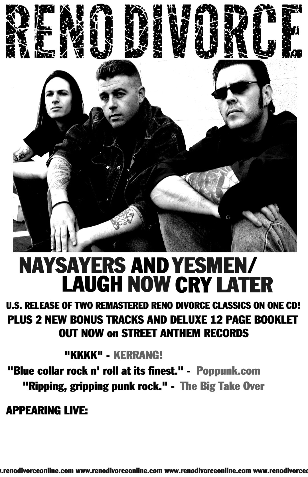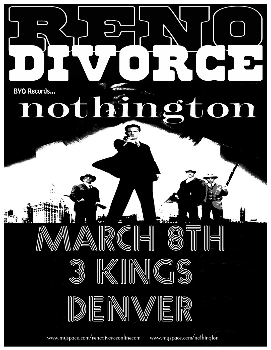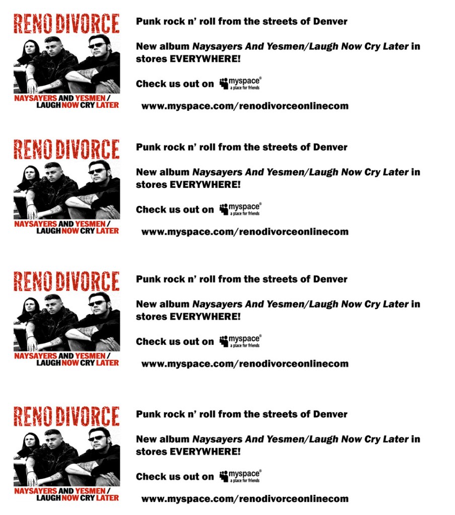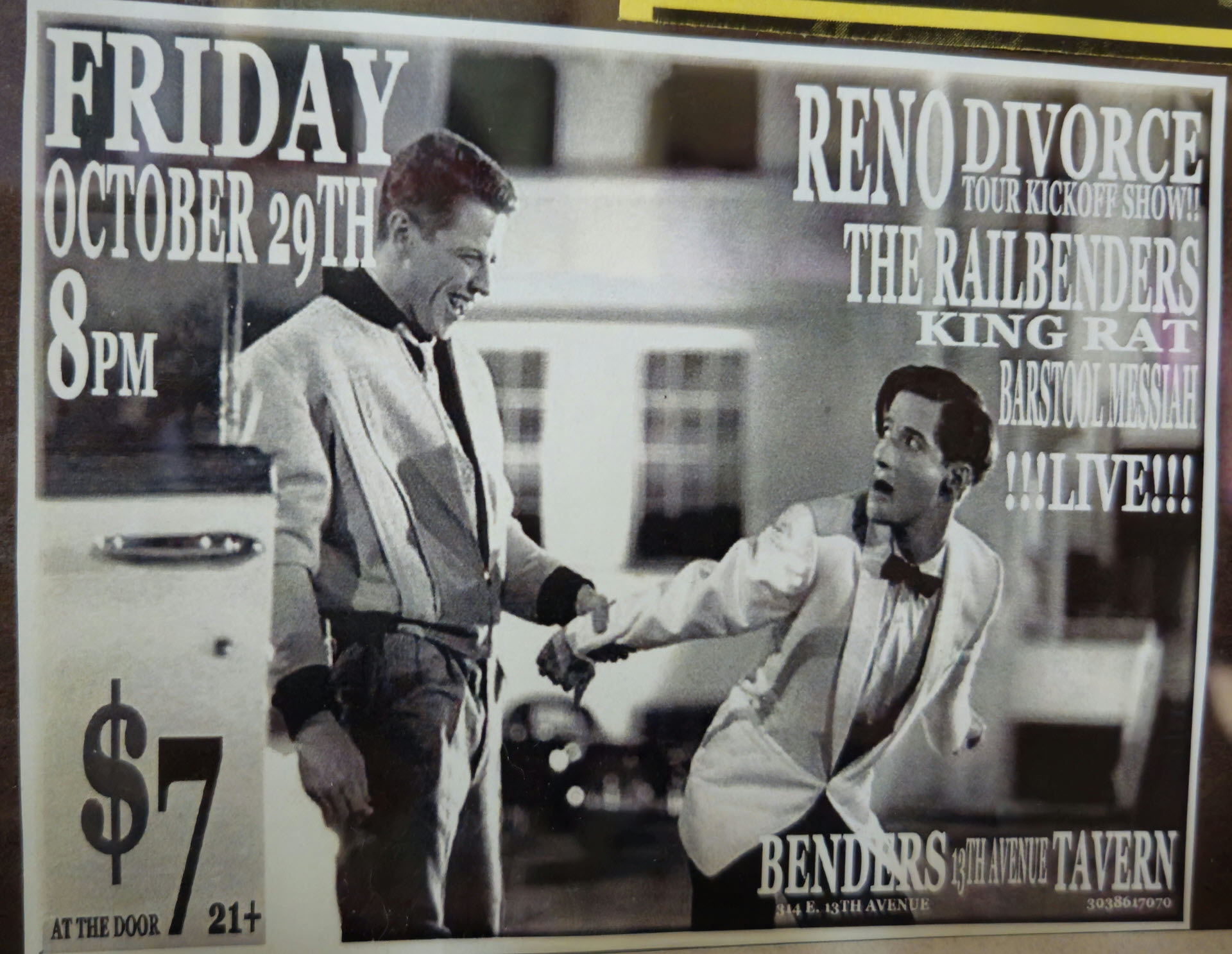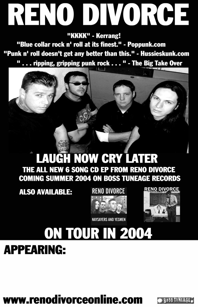 11/4 and both 11/20 shows were canceled.Reno Divorce | Cavern Club | Exeter, UK | 11/14/2004Reno Divorce | Naysayers and Yesmen/Laugh Now Cry Later 2005 advertisementReno Divorce | Bender’s Tavern | Denver, CO | 3/28/2005Reno Divorce | Spring 2005 TourReno Divorce | Spring 2005 TourReno Divorce | 2005 Tour PosterReno Divorce | Naysayers and Yesmen/Laugh Now Cry Later 2005 MySpace handbillsReno Divorce | Striker’s Bar | Superior, WI | 6/11/2005Reno Divorce | Gothic Theater | Denver, CO | 10/28/2005Reno Divorce | Lion’s Lair | Denver, CO | 11/19/2005Reno Divorce | Grindwell Skate Park | Castle Rock, CO | 11/26/2005Reno Divorce | Cricket on the Hill | Denver, CO | 12/3/2005Reno Divorce | December 2005 shows with Agent Orange and the BlastersReno Divorce | Bluebird Theater | Denver, CO | 12/18/2005Reno Divorce | Naysayers and Yesmen/Laugh Now Cry Later 2006 advertisementReno Divorce | 2006 Tour PosterReno Divorce | Spring 2006 TourReno Divorce | Double Down Saloon | Las Vegas, NV | 3/25/2006Reno Divorce | Bluebird Theater | Denver, CO | 7/16/2006Reno Divorce | Palace Ballroom | Colorado Springs, CO | 10/13/2006Reno Divorce | Bender’s Tavern | Denver, CO | 10/20/2006Reno Divorce | 3 Kings | Denver, CO | 11/22/2006Reno Divorce | 3 Kings Tavern | Denver, CO | 1/6/2007Reno Divorce | Marquis Theater | Denver, CO | 1/20/2007Reno Divorce | Cricket on the Hill | Denver, CO | 2/10/2007Reno Divorce | Bender’s Tavern | Denver, CO | 2/18/2007Reno Divorce | 3 Kings Tavern | Denver, CO | 3/8/2007Reno Divorce | Triple Nickel Tavern | Colorado Springs, CO | 3/9/2007Reno Divorce | 12 Volt Tavern | Arvada, CO | 4/7/2007Reno Divorce | Pasquini’s | Denver, CO | 4/27/2007Reno Divorce | 15th St Tavern | Denver, CO | 5/19/2007Reno Divorce | Marquis Theater | Denver, CO | 6/29/2007Reno Divorce | Summer 2007 Tour Reno Divorce | Poster for collaboration with Tattooed Lady clothing | 2007Reno Divorce autographed 8×10 | 2007Reno Divorce | Rocket Room | Colorado Springs, CO | 8/10/2007Reno Divorce | Spotlight Lounge | Grand Junction, CO | 8/11/2007Reno Divorce | Walnut Room | Denver, CO | 8/17/2007Reno Divorce | 12 Volt Tavern | Arvada, CO | 10/26/2007Reno Divorce | Spotlight Lounge | Grand Junction, CO | 10/27/2007Reno Divorce | Bender’s Tavern | Denver, CO | 11/3/2007Reno Divorce | 3 Kings | Denver, CO | 12/21/2007Reno Divorce | Marquis Theater | Denver, CO | 1/19/2008Reno Divorce | February 2008 showsReno Divorce | Bender’s Tavern | Denver, CO | 2/16/2008Reno Divorce | Club Inferno | Denver, CO | 2/29/2008Reno Divorce | Old Curtis Street Pub | Denver, CO | 3/10/2008Reno Divorce | Marquis Theater | Denver, CO | 3/22/2008Reno Divorce | Marquis Theater | Denver, CO | 3/22/2008Reno Divorce | Private Party | Denver, CO | 4/5/2008Reno Divorce | The Black Sheep | Colorado Springs, CO | 5/17/2008Reno Divorce | Spring 2008 TourReno Divorce | 2008 Tour PosterReno Divorce | Kenny B’s | Manitowoc, WI | 5/31/2008Reno Divorce | Bender’s Tavern | Denver, CO | 6/20/2008Reno Divorce | Summer 2008 showsReno Divorce | 3 Kings Tavern | Denver, CO | 8/4/2008Reno Divorce | Ogden Theater | Denver, CO | 1/30/2009Reno Divorce | 3 Kings Tavern | Denver, CO | 2/7/2009Reno Divorce | Sidepocket Lounge | Kilgore, TX | 2/20/2009Reno Divorce | Texas Hotrod Hoedown | New Caney, TX | 2/21/2009Reno Divorce | Bluebird Theater | Denver, CO | 3/13/2009The Mansfields | Tonic | Reno, NV | 3/14/2009 Reno Divorce | Bender’s Tavern | Denver, CO | 4/17/2009Reno Divorce | Bender’s Tavern | Denver, CO | 4/17/2009Reno Divorce | Bluebird Theater | Denver, CO | 5/2/2009Reno Divorce | 3 Kings | Denver, CO | 5/20/2009Reno Divorce | Celtic House Pub | Parker, CO | 5/23/2009Reno Divorce | Westword Music Showcase | Bannock Street Garage | Denver, CO | 6/13/2009Reno Divorce | Marquis Theater | Denver, CO | 6/26/2009Reno Divorce | Marquis Theater | Denver, CO | 6/26/2009Reno Divorce | European Tour Poster | July 2009Reno Divorce | I Scream Records poster for Tears Before Breakfast and Summer 2009 European TourReno Divorce | Club Bogaloo | Pfarrkirchen, GERMANY | 7/10/2009Reno Divorce | Sjock Festival | Gierle, BELGIUM | 7/11/2009Reno Divorce | Trix | Antwerp, BELGIUM | 7/12/2009Reno Divorce | Walfisch | Freiburg, GERMANY | 7/14/2009 Schedule lists old date of 8/8, before show was moved to 7/14Reno Divorce | Herman’s Hideaway | Denver, CO | 9/18/2009Reno Divorce | Herman’s Hideaway | Denver, CO | 9/18/2009Reno Divorce | European Tour Poster | November & December 2009Reno Divorce | Archiv | Potsdam, GERMANY | 11/21/2009Reno Divorce | Dekompresja | Lodz, POLAND | 11/22/2009Reno Divorce | Ucho | Gdynia, POLAND | 11/23/2009Reno Divorce | Viper Room | Vienna, AUSTRIA | 11/25/2009Reno Divorce | Speedfest | Eindhoven, NETHERLANDS | 11/28/2009Reno Divorce | Kato Club | Berlin, GERMANY | 11/30/2009Reno Divorce | City Invasion | Sheffield & London, UK| 12/5 & 12/6/2009Reno Divorce | AZ | Aachen, GERMANY | 12/7/2009Reno Divorce | Az | Aachen, GERMANY | 12/7/2009Reno Divorce | Ogden Theater | Denver, CO | 1/14/2010Reno Divorce | Marquis Theater | Denver, CO | 2/6/2010Reno Divorce | Herman’s Hideaway | Denver, CO | 2/20/2010Reno Divorce | Herman’s Hideaway | Denver, CO | 2/20/2010Reno Divorce | Texas Hotrod Hoedown | New Caney, TX | 2/27/2010To The Glorious Lonely | Fuel | Seattle, WA | 4/10/2010 | Reunited onstage with Jeff Rouse of Rhino Humpers.Third Law of Motion | Fuel | Seattle, WA | 5/27/2011Third Law of Motion Setlist | 2011Third Law of Motion | Backstage Bar and Grill | Tacoma, WA | 3/17/2012 | To date, my last time playing drums on stage.