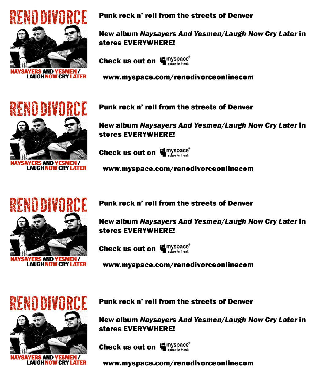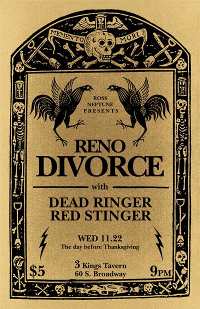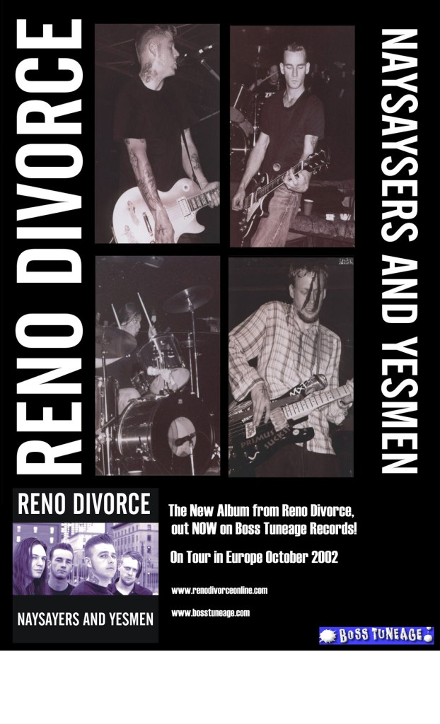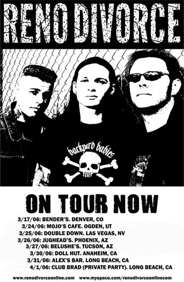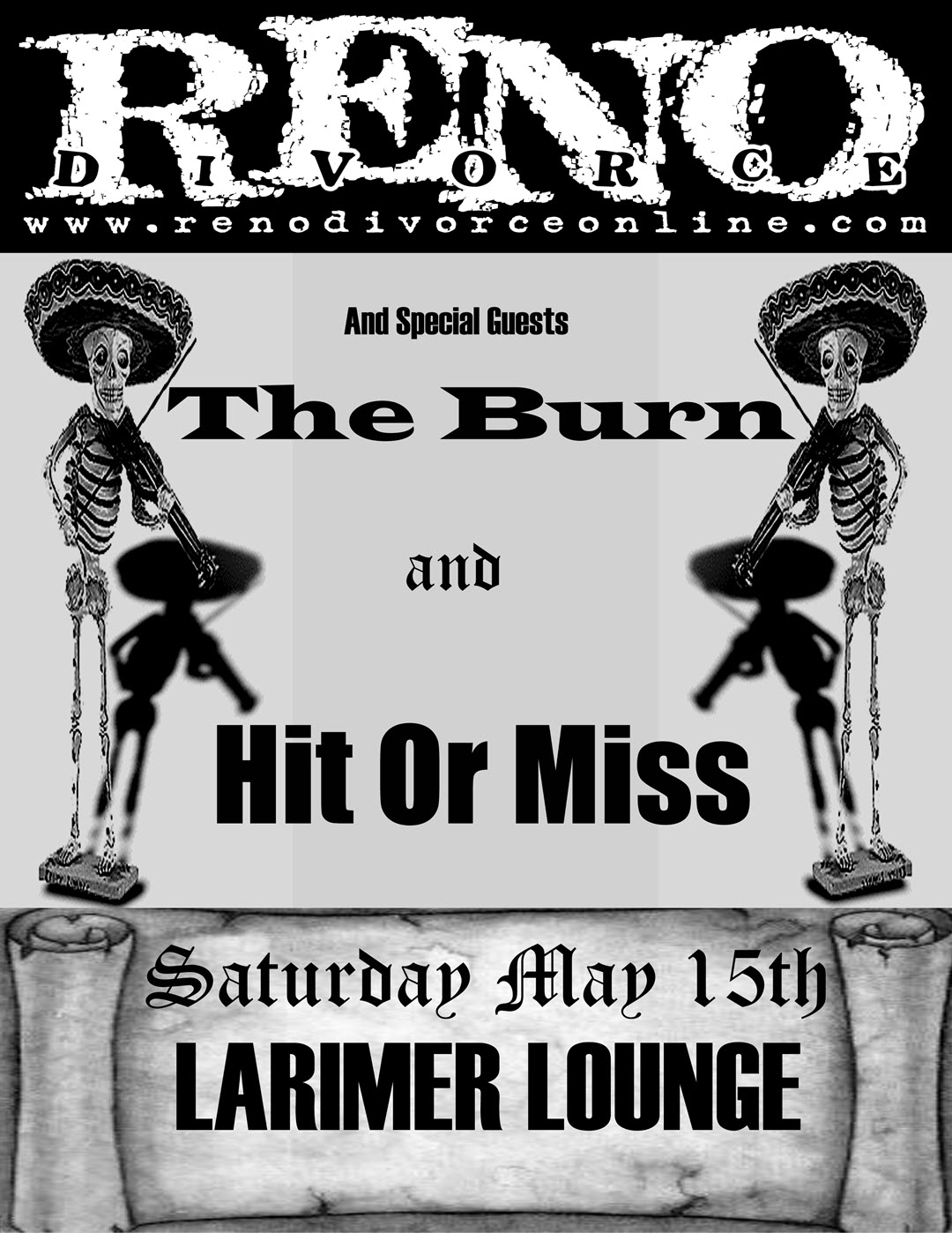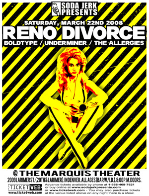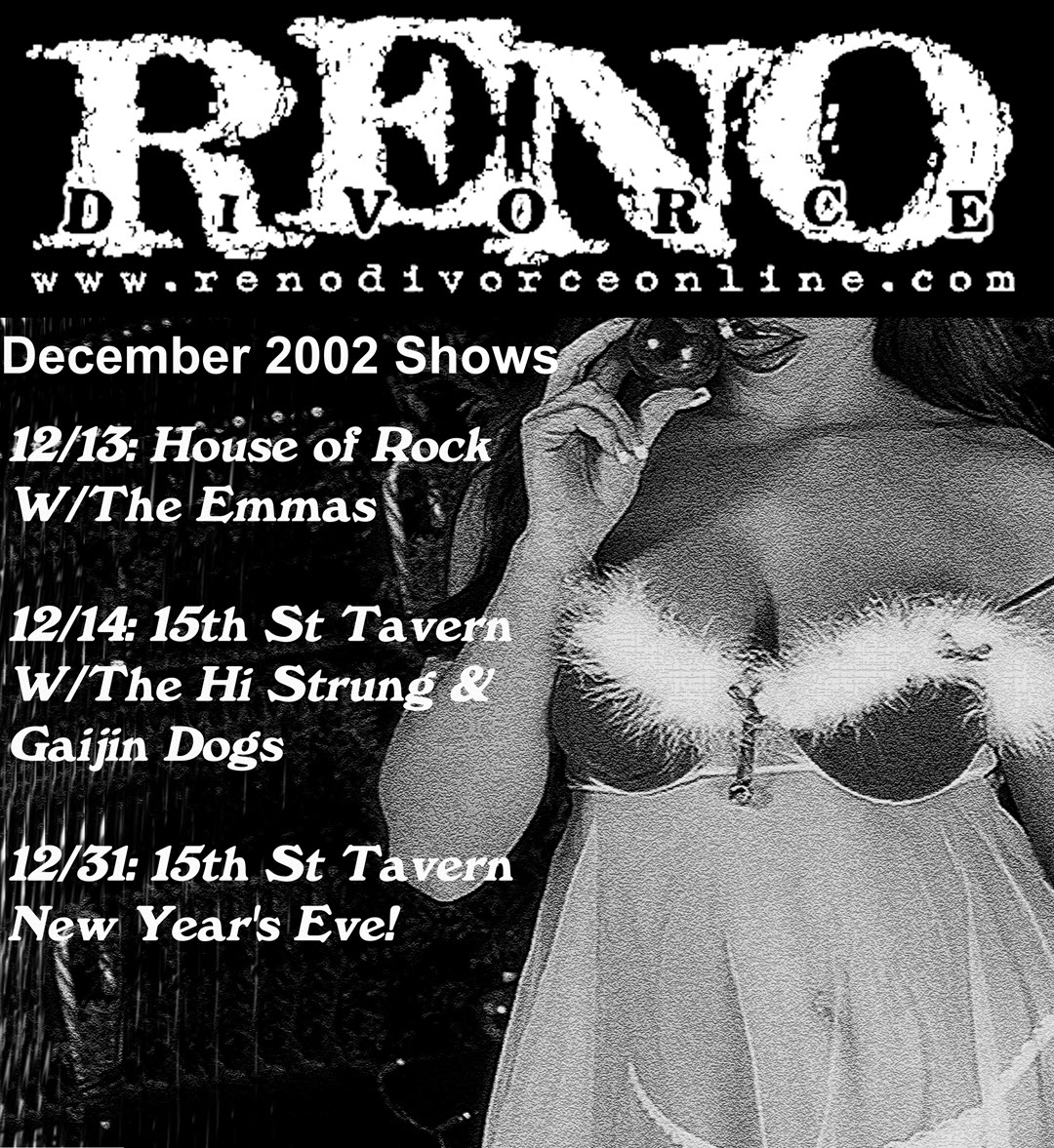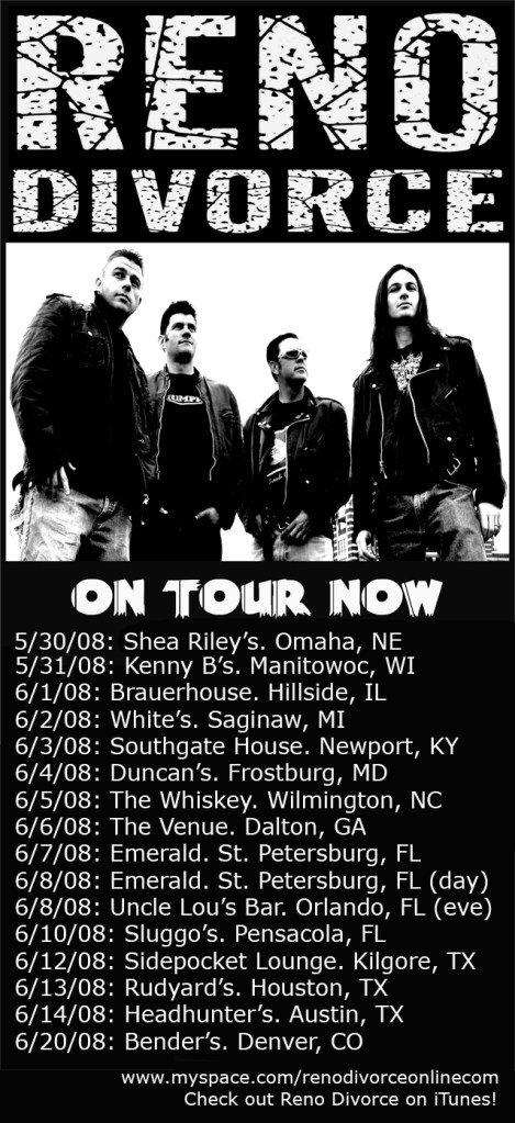 11/4 and both 11/20 shows were canceled.Reno Divorce | Cavern Club | Exeter, UK | 11/14/2004Reno Divorce | Naysayers and Yesmen/Laugh Now Cry Later 2005 advertisementReno Divorce | Bender’s Tavern | Denver, CO | 3/28/2005Reno Divorce | Spring 2005 TourReno Divorce | Spring 2005 TourReno Divorce | 2005 Tour PosterReno Divorce | Naysayers and Yesmen/Laugh Now Cry Later 2005 MySpace handbillsReno Divorce | Striker’s Bar | Superior, WI | 6/11/2005Reno Divorce | Gothic Theater | Denver, CO | 10/28/2005Reno Divorce | Lion’s Lair | Denver, CO | 11/19/2005Reno Divorce | Grindwell Skate Park | Castle Rock, CO | 11/26/2005Reno Divorce | Cricket on the Hill | Denver, CO | 12/3/2005Reno Divorce | December 2005 shows with Agent Orange and the BlastersReno Divorce | Bluebird Theater | Denver, CO | 12/18/2005Reno Divorce | Naysayers and Yesmen/Laugh Now Cry Later 2006 advertisementReno Divorce | 2006 Tour PosterReno Divorce | Spring 2006 TourReno Divorce | Double Down Saloon | Las Vegas, NV | 3/25/2006Reno Divorce | Bluebird Theater | Denver, CO | 7/16/2006Reno Divorce | Palace Ballroom | Colorado Springs, CO | 10/13/2006Reno Divorce | Bender’s Tavern | Denver, CO | 10/20/2006Reno Divorce | 3 Kings | Denver, CO | 11/22/2006Reno Divorce | 3 Kings Tavern | Denver, CO | 1/6/2007Reno Divorce | Marquis Theater | Denver, CO | 1/20/2007Reno Divorce | Cricket on the Hill | Denver, CO | 2/10/2007Reno Divorce | Bender’s Tavern | Denver, CO | 2/18/2007Reno Divorce | 3 Kings Tavern | Denver, CO | 3/8/2007Reno Divorce | Triple Nickel Tavern | Colorado Springs, CO | 3/9/2007Reno Divorce | 12 Volt Tavern | Arvada, CO | 4/7/2007Reno Divorce | Pasquini’s | Denver, CO | 4/27/2007Reno Divorce | 15th St Tavern | Denver, CO | 5/19/2007Reno Divorce | Marquis Theater | Denver, CO | 6/29/2007Reno Divorce | Summer 2007 Tour Reno Divorce | Poster for collaboration with Tattooed Lady clothing | 2007Reno Divorce autographed 8×10 | 2007Reno Divorce | Rocket Room | Colorado Springs, CO | 8/10/2007Reno Divorce | Spotlight Lounge | Grand Junction, CO | 8/11/2007Reno Divorce | Walnut Room | Denver, CO | 8/17/2007Reno Divorce | 12 Volt Tavern | Arvada, CO | 10/26/2007Reno Divorce | Spotlight Lounge | Grand Junction, CO | 10/27/2007Reno Divorce | Bender’s Tavern | Denver, CO | 11/3/2007Reno Divorce | 3 Kings | Denver, CO | 12/21/2007Reno Divorce | Marquis Theater | Denver, CO | 1/19/2008Reno Divorce | February 2008 showsReno Divorce | Bender’s Tavern | Denver, CO | 2/16/2008Reno Divorce | Club Inferno | Denver, CO | 2/29/2008Reno Divorce | Old Curtis Street Pub | Denver, CO | 3/10/2008Reno Divorce | Marquis Theater | Denver, CO | 3/22/2008Reno Divorce | Marquis Theater | Denver, CO | 3/22/2008Reno Divorce | Private Party | Denver, CO | 4/5/2008Reno Divorce | The Black Sheep | Colorado Springs, CO | 5/17/2008Reno Divorce | Spring 2008 TourReno Divorce | 2008 Tour PosterReno Divorce | Kenny B’s | Manitowoc, WI | 5/31/2008Reno Divorce | Bender’s Tavern | Denver, CO | 6/20/2008Reno Divorce | Summer 2008 showsReno Divorce | 3 Kings Tavern | Denver, CO | 8/4/2008Reno Divorce | Ogden Theater | Denver, CO | 1/30/2009Reno Divorce | 3 Kings Tavern | Denver, CO | 2/7/2009Reno Divorce | Sidepocket Lounge | Kilgore, TX | 2/20/2009Reno Divorce | Texas Hotrod Hoedown | New Caney, TX | 2/21/2009Reno Divorce | Bluebird Theater | Denver, CO | 3/13/2009The Mansfields | Tonic | Reno, NV | 3/14/2009 Reno Divorce | Bender’s Tavern | Denver, CO | 4/17/2009Reno Divorce | Bender’s Tavern | Denver, CO | 4/17/2009Reno Divorce | Bluebird Theater | Denver, CO | 5/2/2009Reno Divorce | 3 Kings | Denver, CO | 5/20/2009Reno Divorce | Celtic House Pub | Parker, CO | 5/23/2009Reno Divorce | Westword Music Showcase | Bannock Street Garage | Denver, CO | 6/13/2009Reno Divorce | Marquis Theater | Denver, CO | 6/26/2009Reno Divorce | Marquis Theater | Denver, CO | 6/26/2009Reno Divorce | European Tour Poster | July 2009Reno Divorce | I Scream Records poster for Tears Before Breakfast and Summer 2009 European TourReno Divorce | Club Bogaloo | Pfarrkirchen, GERMANY | 7/10/2009Reno Divorce | Sjock Festival | Gierle, BELGIUM | 7/11/2009Reno Divorce | Trix | Antwerp, BELGIUM | 7/12/2009Reno Divorce | Walfisch | Freiburg, GERMANY | 7/14/2009 Schedule lists old date of 8/8, before show was moved to 7/14Reno Divorce | Herman’s Hideaway | Denver, CO | 9/18/2009Reno Divorce | Herman’s Hideaway | Denver, CO | 9/18/2009Reno Divorce | European Tour Poster | November & December 2009Reno Divorce | Archiv | Potsdam, GERMANY | 11/21/2009Reno Divorce | Dekompresja | Lodz, POLAND | 11/22/2009Reno Divorce | Ucho | Gdynia, POLAND | 11/23/2009Reno Divorce | Viper Room | Vienna, AUSTRIA | 11/25/2009Reno Divorce | Speedfest | Eindhoven, NETHERLANDS | 11/28/2009Reno Divorce | Kato Club | Berlin, GERMANY | 11/30/2009Reno Divorce | City Invasion | Sheffield & London, UK| 12/5 & 12/6/2009Reno Divorce | AZ | Aachen, GERMANY | 12/7/2009Reno Divorce | Az | Aachen, GERMANY | 12/7/2009Reno Divorce | Ogden Theater | Denver, CO | 1/14/2010Reno Divorce | Marquis Theater | Denver, CO | 2/6/2010Reno Divorce | Herman’s Hideaway | Denver, CO | 2/20/2010Reno Divorce | Herman’s Hideaway | Denver, CO | 2/20/2010Reno Divorce | Texas Hotrod Hoedown | New Caney, TX | 2/27/2010To The Glorious Lonely | Fuel | Seattle, WA | 4/10/2010 | Reunited onstage with Jeff Rouse of Rhino Humpers.Third Law of Motion | Fuel | Seattle, WA | 5/27/2011Third Law of Motion Setlist | 2011Third Law of Motion | Backstage Bar and Grill | Tacoma, WA | 3/17/2012 | To date, my last time playing drums on stage.