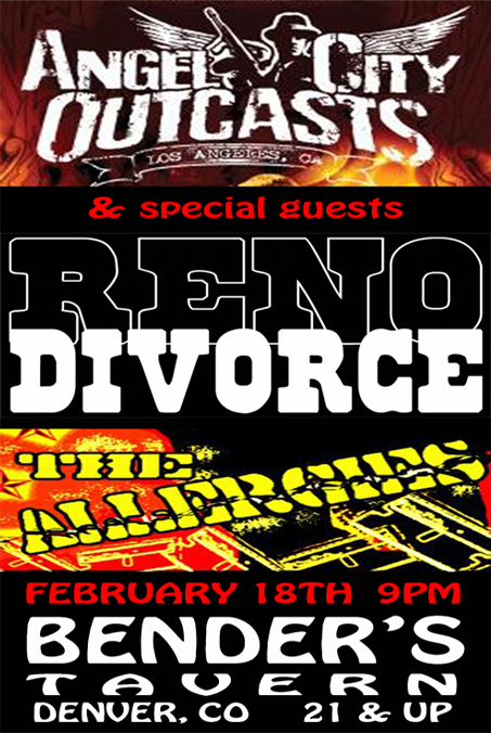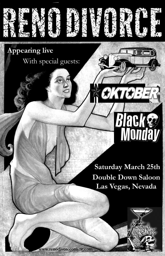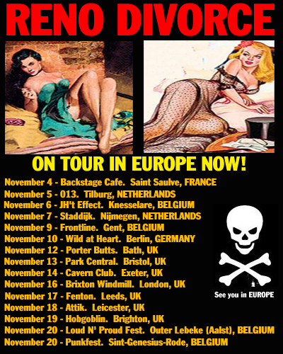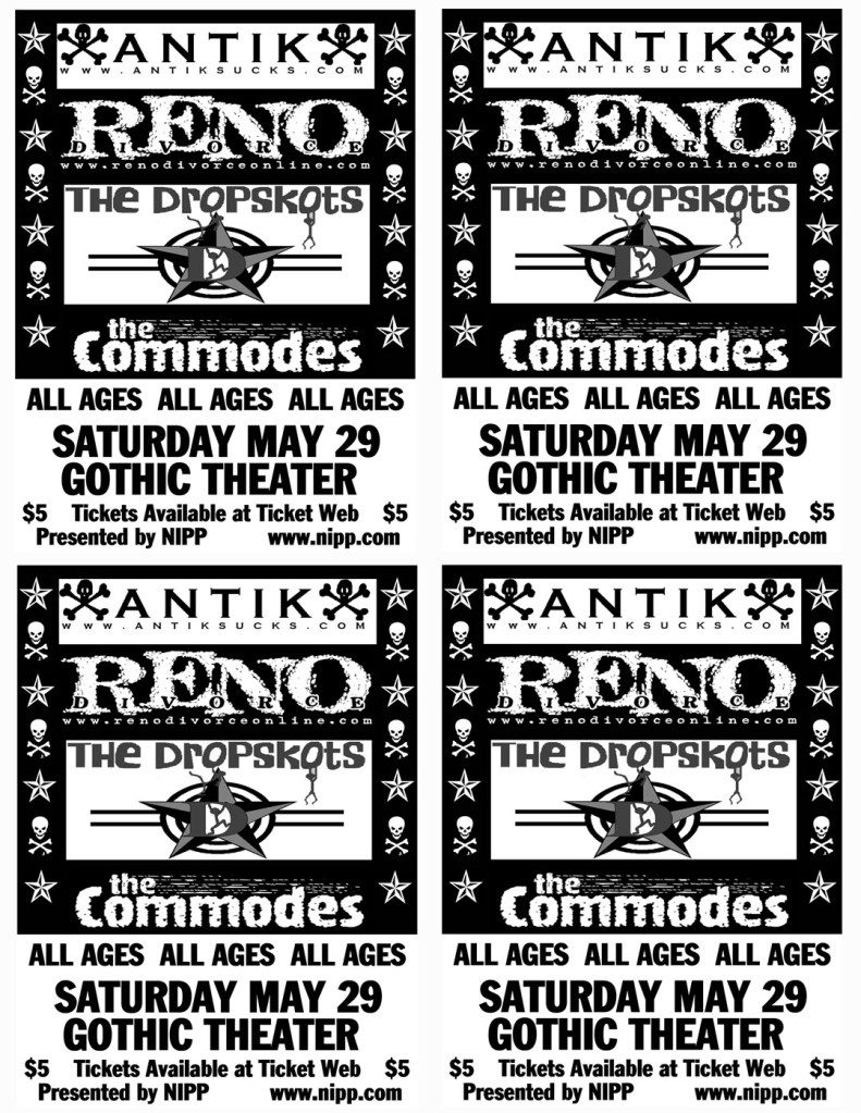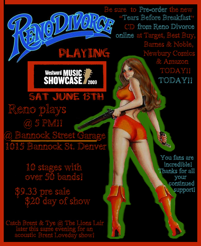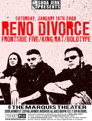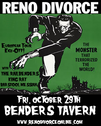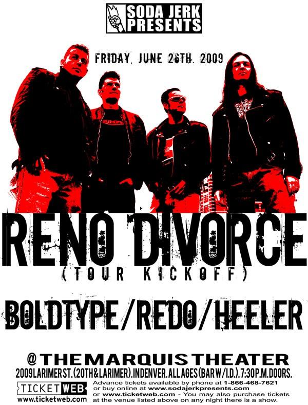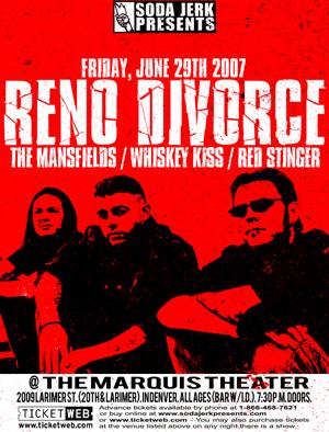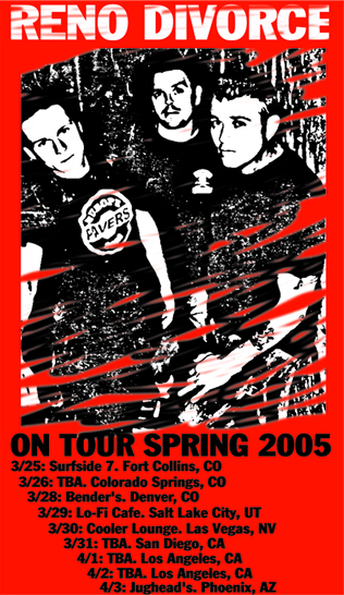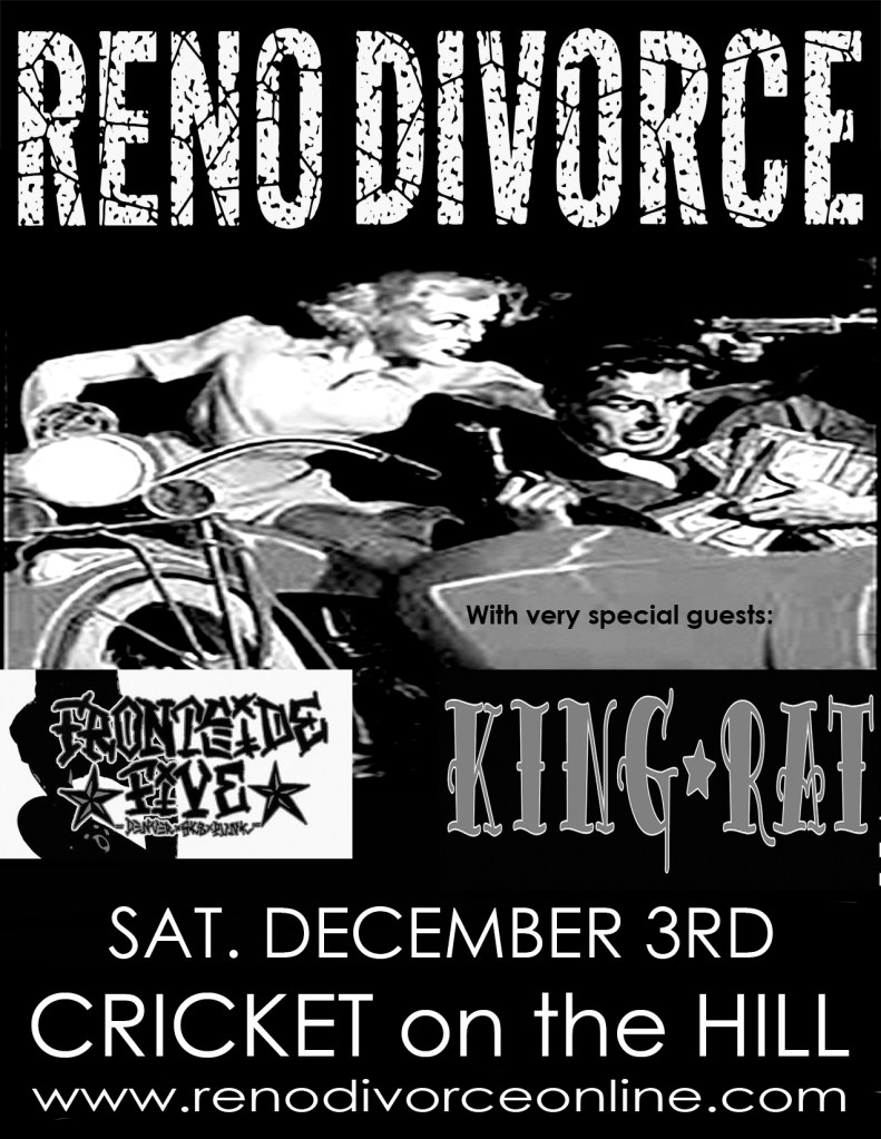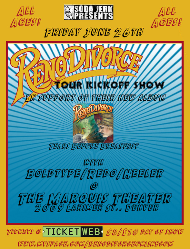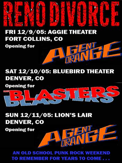11/4 and both 11/20 shows were canceled.Reno Divorce | Cavern Club | Exeter, UK | 11/14/2004Reno Divorce | Naysayers and Yesmen/Laugh Now Cry Later 2005 advertisementReno Divorce | Bender’s Tavern | Denver, CO | 3/28/2005Reno Divorce | Spring 2005 TourReno Divorce | Spring 2005 TourReno Divorce | 2005 Tour PosterReno Divorce | Naysayers and Yesmen/Laugh Now Cry Later 2005 MySpace handbillsReno Divorce | Striker’s Bar | Superior, WI | 6/11/2005Reno Divorce | Gothic Theater | Denver, CO | 10/28/2005Reno Divorce | Lion’s Lair | Denver, CO | 11/19/2005Reno Divorce | Grindwell Skate Park | Castle Rock, CO | 11/26/2005Reno Divorce | Cricket on the Hill | Denver, CO | 12/3/2005Reno Divorce | December 2005 shows with Agent Orange and the BlastersReno Divorce | Bluebird Theater | Denver, CO | 12/18/2005Reno Divorce | Naysayers and Yesmen/Laugh Now Cry Later 2006 advertisementReno Divorce | 2006 Tour PosterReno Divorce | Spring 2006 TourReno Divorce | Double Down Saloon | Las Vegas, NV | 3/25/2006Reno Divorce | Bluebird Theater | Denver, CO | 7/16/2006Reno Divorce | Palace Ballroom | Colorado Springs, CO | 10/13/2006Reno Divorce | Bender’s Tavern | Denver, CO | 10/20/2006Reno Divorce | 3 Kings | Denver, CO | 11/22/2006Reno Divorce | 3 Kings Tavern | Denver, CO | 1/6/2007Reno Divorce | Marquis Theater | Denver, CO | 1/20/2007Reno Divorce | Cricket on the Hill | Denver, CO | 2/10/2007Reno Divorce | Bender’s Tavern | Denver, CO | 2/18/2007Reno Divorce | 3 Kings Tavern | Denver, CO | 3/8/2007Reno Divorce | Triple Nickel Tavern | Colorado Springs, CO | 3/9/2007Reno Divorce | 12 Volt Tavern | Arvada, CO | 4/7/2007Reno Divorce | Pasquini’s | Denver, CO | 4/27/2007Reno Divorce | 15th St Tavern | Denver, CO | 5/19/2007Reno Divorce | Marquis Theater | Denver, CO | 6/29/2007Reno Divorce | Summer 2007 Tour Reno Divorce | Poster for collaboration with Tattooed Lady clothing | 2007Reno Divorce autographed 8×10 | 2007Reno Divorce | Rocket Room | Colorado Springs, CO | 8/10/2007Reno Divorce | Spotlight Lounge | Grand Junction, CO | 8/11/2007Reno Divorce | Walnut Room | Denver, CO | 8/17/2007Reno Divorce | 12 Volt Tavern | Arvada, CO | 10/26/2007Reno Divorce | Spotlight Lounge | Grand Junction, CO | 10/27/2007Reno Divorce | Bender’s Tavern | Denver, CO | 11/3/2007Reno Divorce | 3 Kings | Denver, CO | 12/21/2007Reno Divorce | Marquis Theater | Denver, CO | 1/19/2008Reno Divorce | February 2008 showsReno Divorce | Bender’s Tavern | Denver, CO | 2/16/2008Reno Divorce | Club Inferno | Denver, CO | 2/29/2008Reno Divorce | Old Curtis Street Pub | Denver, CO | 3/10/2008Reno Divorce | Marquis Theater | Denver, CO | 3/22/2008Reno Divorce | Marquis Theater | Denver, CO | 3/22/2008Reno Divorce | Private Party | Denver, CO | 4/5/2008Reno Divorce | The Black Sheep | Colorado Springs, CO | 5/17/2008Reno Divorce | Spring 2008 TourReno Divorce | 2008 Tour PosterReno Divorce | Kenny B’s | Manitowoc, WI | 5/31/2008Reno Divorce | Bender’s Tavern | Denver, CO | 6/20/2008Reno Divorce | Summer 2008 showsReno Divorce | 3 Kings Tavern | Denver, CO | 8/4/2008Reno Divorce | Ogden Theater | Denver, CO | 1/30/2009Reno Divorce | 3 Kings Tavern | Denver, CO | 2/7/2009Reno Divorce | Sidepocket Lounge | Kilgore, TX | 2/20/2009Reno Divorce | Texas Hotrod Hoedown | New Caney, TX | 2/21/2009Reno Divorce | Bluebird Theater | Denver, CO | 3/13/2009The Mansfields | Tonic | Reno, NV | 3/14/2009 Reno Divorce | Bender’s Tavern | Denver, CO | 4/17/2009Reno Divorce | Bender’s Tavern | Denver, CO | 4/17/2009Reno Divorce | Bluebird Theater | Denver, CO | 5/2/2009Reno Divorce | 3 Kings | Denver, CO | 5/20/2009Reno Divorce | Celtic House Pub | Parker, CO | 5/23/2009Reno Divorce | Westword Music Showcase | Bannock Street Garage | Denver, CO | 6/13/2009Reno Divorce | Marquis Theater | Denver, CO | 6/26/2009Reno Divorce | Marquis Theater | Denver, CO | 6/26/2009Reno Divorce | European Tour Poster | July 2009Reno Divorce | I Scream Records poster for Tears Before Breakfast and Summer 2009 European TourReno Divorce | Club Bogaloo | Pfarrkirchen, GERMANY | 7/10/2009Reno Divorce | Sjock Festival | Gierle, BELGIUM | 7/11/2009Reno Divorce | Trix | Antwerp, BELGIUM | 7/12/2009Reno Divorce | Walfisch | Freiburg, GERMANY | 7/14/2009 Schedule lists old date of 8/8, before show was moved to 7/14Reno Divorce | Herman’s Hideaway | Denver, CO | 9/18/2009Reno Divorce | Herman’s Hideaway | Denver, CO | 9/18/2009Reno Divorce | European Tour Poster | November & December 2009Reno Divorce | Archiv | Potsdam, GERMANY | 11/21/2009Reno Divorce | Dekompresja | Lodz, POLAND | 11/22/2009Reno Divorce | Ucho | Gdynia, POLAND | 11/23/2009Reno Divorce | Viper Room | Vienna, AUSTRIA | 11/25/2009Reno Divorce | Speedfest | Eindhoven, NETHERLANDS | 11/28/2009Reno Divorce | Kato Club | Berlin, GERMANY | 11/30/2009Reno Divorce | City Invasion | Sheffield & London, UK| 12/5 & 12/6/2009Reno Divorce | AZ | Aachen, GERMANY | 12/7/2009Reno Divorce | Az | Aachen, GERMANY | 12/7/2009Reno Divorce | Ogden Theater | Denver, CO | 1/14/2010Reno Divorce | Marquis Theater | Denver, CO | 2/6/2010Reno Divorce | Herman’s Hideaway | Denver, CO | 2/20/2010Reno Divorce | Herman’s Hideaway | Denver, CO | 2/20/2010Reno Divorce | Texas Hotrod Hoedown | New Caney, TX | 2/27/2010To The Glorious Lonely | Fuel | Seattle, WA | 4/10/2010 | Reunited onstage with Jeff Rouse of Rhino Humpers.Third Law of Motion | Fuel | Seattle, WA | 5/27/2011Third Law of Motion Setlist | 2011Third Law of Motion | Backstage Bar and Grill | Tacoma, WA | 3/17/2012 | To date, my last time playing drums on stage.