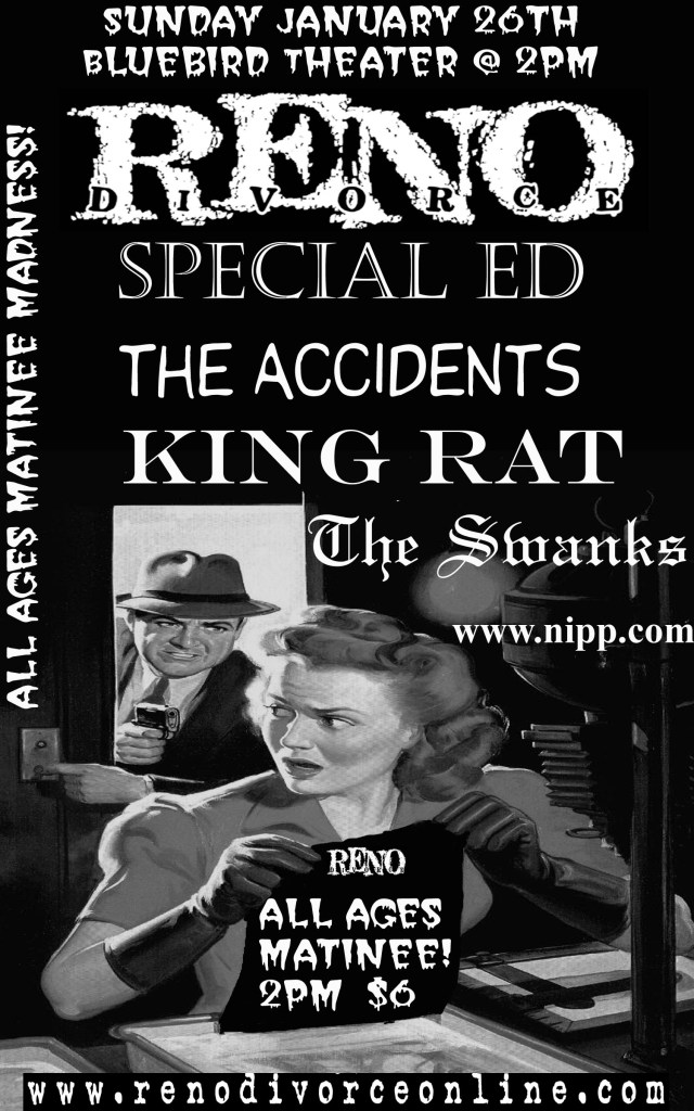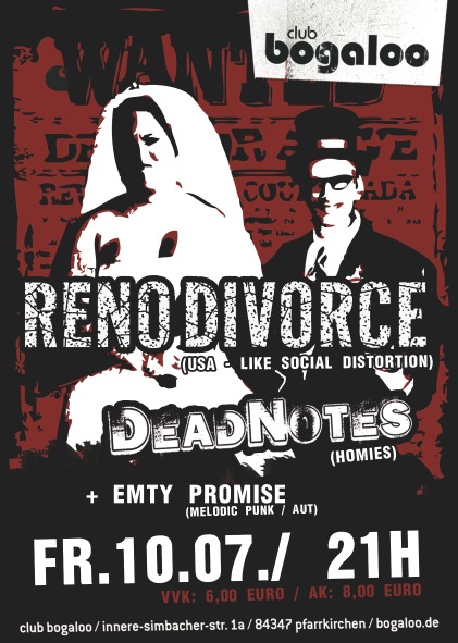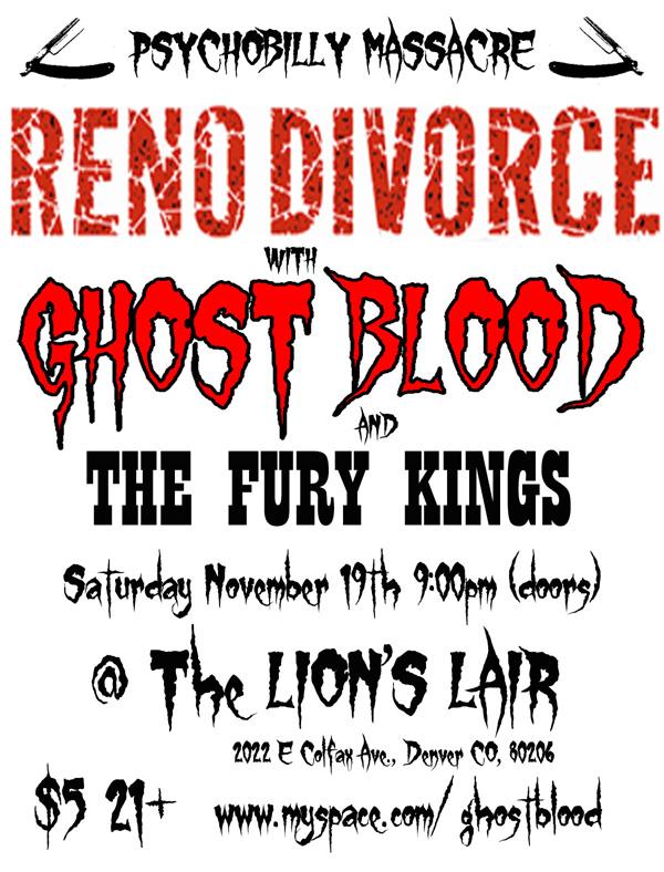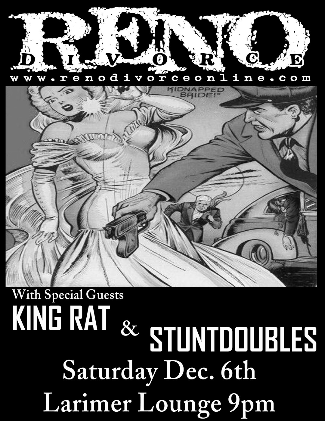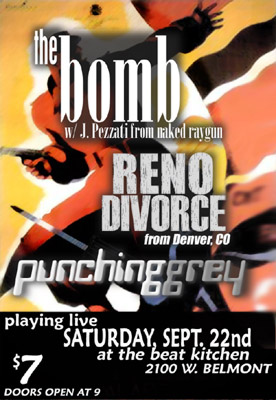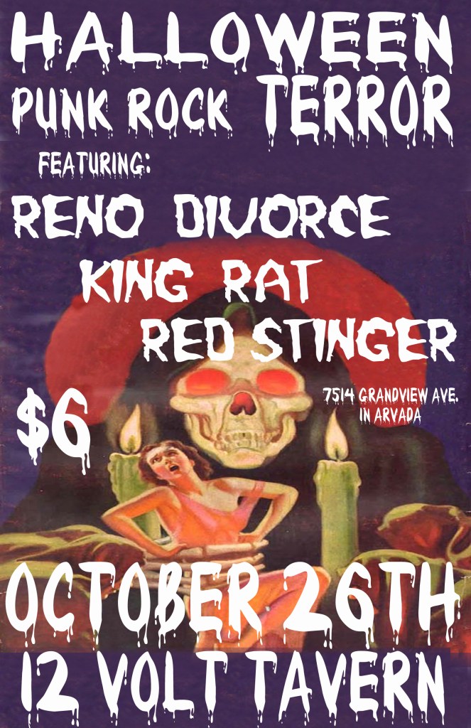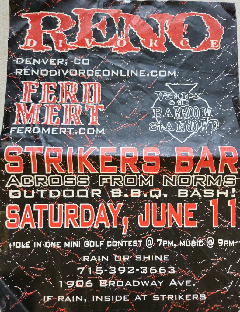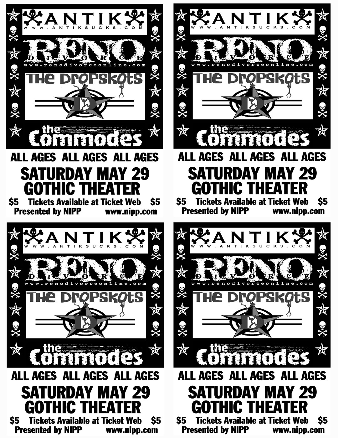 11/4 and both 11/20 shows were canceled.Reno Divorce | Cavern Club | Exeter, UK | 11/14/2004Reno Divorce | Naysayers and Yesmen/Laugh Now Cry Later 2005 advertisementReno Divorce | Bender’s Tavern | Denver, CO | 3/28/2005Reno Divorce | Spring 2005 TourReno Divorce | Spring 2005 TourReno Divorce | 2005 Tour PosterReno Divorce | Naysayers and Yesmen/Laugh Now Cry Later 2005 MySpace handbillsReno Divorce | Striker’s Bar | Superior, WI | 6/11/2005Reno Divorce | Gothic Theater | Denver, CO | 10/28/2005Reno Divorce | Lion’s Lair | Denver, CO | 11/19/2005Reno Divorce | Grindwell Skate Park | Castle Rock, CO | 11/26/2005Reno Divorce | Cricket on the Hill | Denver, CO | 12/3/2005Reno Divorce | December 2005 shows with Agent Orange and the BlastersReno Divorce | Bluebird Theater | Denver, CO | 12/18/2005Reno Divorce | Naysayers and Yesmen/Laugh Now Cry Later 2006 advertisementReno Divorce | 2006 Tour PosterReno Divorce | Spring 2006 TourReno Divorce | Double Down Saloon | Las Vegas, NV | 3/25/2006Reno Divorce | Bluebird Theater | Denver, CO | 7/16/2006Reno Divorce | Palace Ballroom | Colorado Springs, CO | 10/13/2006Reno Divorce | Bender’s Tavern | Denver, CO | 10/20/2006Reno Divorce | 3 Kings | Denver, CO | 11/22/2006Reno Divorce | 3 Kings Tavern | Denver, CO | 1/6/2007Reno Divorce | Marquis Theater | Denver, CO | 1/20/2007Reno Divorce | Cricket on the Hill | Denver, CO | 2/10/2007Reno Divorce | Bender’s Tavern | Denver, CO | 2/18/2007Reno Divorce | 3 Kings Tavern | Denver, CO | 3/8/2007Reno Divorce | Triple Nickel Tavern | Colorado Springs, CO | 3/9/2007Reno Divorce | 12 Volt Tavern | Arvada, CO | 4/7/2007Reno Divorce | Pasquini’s | Denver, CO | 4/27/2007Reno Divorce | 15th St Tavern | Denver, CO | 5/19/2007Reno Divorce | Marquis Theater | Denver, CO | 6/29/2007Reno Divorce | Summer 2007 Tour Reno Divorce | Poster for collaboration with Tattooed Lady clothing | 2007Reno Divorce autographed 8×10 | 2007Reno Divorce | Rocket Room | Colorado Springs, CO | 8/10/2007Reno Divorce | Spotlight Lounge | Grand Junction, CO | 8/11/2007Reno Divorce | Walnut Room | Denver, CO | 8/17/2007Reno Divorce | 12 Volt Tavern | Arvada, CO | 10/26/2007Reno Divorce | Spotlight Lounge | Grand Junction, CO | 10/27/2007Reno Divorce | Bender’s Tavern | Denver, CO | 11/3/2007Reno Divorce | 3 Kings | Denver, CO | 12/21/2007Reno Divorce | Marquis Theater | Denver, CO | 1/19/2008Reno Divorce | February 2008 showsReno Divorce | Bender’s Tavern | Denver, CO | 2/16/2008Reno Divorce | Club Inferno | Denver, CO | 2/29/2008Reno Divorce | Old Curtis Street Pub | Denver, CO | 3/10/2008Reno Divorce | Marquis Theater | Denver, CO | 3/22/2008Reno Divorce | Marquis Theater | Denver, CO | 3/22/2008Reno Divorce | Private Party | Denver, CO | 4/5/2008Reno Divorce | The Black Sheep | Colorado Springs, CO | 5/17/2008Reno Divorce | Spring 2008 TourReno Divorce | 2008 Tour PosterReno Divorce | Kenny B’s | Manitowoc, WI | 5/31/2008Reno Divorce | Bender’s Tavern | Denver, CO | 6/20/2008Reno Divorce | Summer 2008 showsReno Divorce | 3 Kings Tavern | Denver, CO | 8/4/2008Reno Divorce | Ogden Theater | Denver, CO | 1/30/2009Reno Divorce | 3 Kings Tavern | Denver, CO | 2/7/2009Reno Divorce | Sidepocket Lounge | Kilgore, TX | 2/20/2009Reno Divorce | Texas Hotrod Hoedown | New Caney, TX | 2/21/2009Reno Divorce | Bluebird Theater | Denver, CO | 3/13/2009The Mansfields | Tonic | Reno, NV | 3/14/2009 Reno Divorce | Bender’s Tavern | Denver, CO | 4/17/2009Reno Divorce | Bender’s Tavern | Denver, CO | 4/17/2009Reno Divorce | Bluebird Theater | Denver, CO | 5/2/2009Reno Divorce | 3 Kings | Denver, CO | 5/20/2009Reno Divorce | Celtic House Pub | Parker, CO | 5/23/2009Reno Divorce | Westword Music Showcase | Bannock Street Garage | Denver, CO | 6/13/2009Reno Divorce | Marquis Theater | Denver, CO | 6/26/2009Reno Divorce | Marquis Theater | Denver, CO | 6/26/2009Reno Divorce | European Tour Poster | July 2009Reno Divorce | I Scream Records poster for Tears Before Breakfast and Summer 2009 European TourReno Divorce | Club Bogaloo | Pfarrkirchen, GERMANY | 7/10/2009Reno Divorce | Sjock Festival | Gierle, BELGIUM | 7/11/2009Reno Divorce | Trix | Antwerp, BELGIUM | 7/12/2009Reno Divorce | Walfisch | Freiburg, GERMANY | 7/14/2009 Schedule lists old date of 8/8, before show was moved to 7/14Reno Divorce | Herman’s Hideaway | Denver, CO | 9/18/2009Reno Divorce | Herman’s Hideaway | Denver, CO | 9/18/2009Reno Divorce | European Tour Poster | November & December 2009Reno Divorce | Archiv | Potsdam, GERMANY | 11/21/2009Reno Divorce | Dekompresja | Lodz, POLAND | 11/22/2009Reno Divorce | Ucho | Gdynia, POLAND | 11/23/2009Reno Divorce | Viper Room | Vienna, AUSTRIA | 11/25/2009Reno Divorce | Speedfest | Eindhoven, NETHERLANDS | 11/28/2009Reno Divorce | Kato Club | Berlin, GERMANY | 11/30/2009Reno Divorce | City Invasion | Sheffield & London, UK| 12/5 & 12/6/2009Reno Divorce | AZ | Aachen, GERMANY | 12/7/2009Reno Divorce | Az | Aachen, GERMANY | 12/7/2009Reno Divorce | Ogden Theater | Denver, CO | 1/14/2010Reno Divorce | Marquis Theater | Denver, CO | 2/6/2010Reno Divorce | Herman’s Hideaway | Denver, CO | 2/20/2010Reno Divorce | Herman’s Hideaway | Denver, CO | 2/20/2010Reno Divorce | Texas Hotrod Hoedown | New Caney, TX | 2/27/2010To The Glorious Lonely | Fuel | Seattle, WA | 4/10/2010 | Reunited onstage with Jeff Rouse of Rhino Humpers.Third Law of Motion | Fuel | Seattle, WA | 5/27/2011Third Law of Motion Setlist | 2011Third Law of Motion | Backstage Bar and Grill | Tacoma, WA | 3/17/2012 | To date, my last time playing drums on stage.