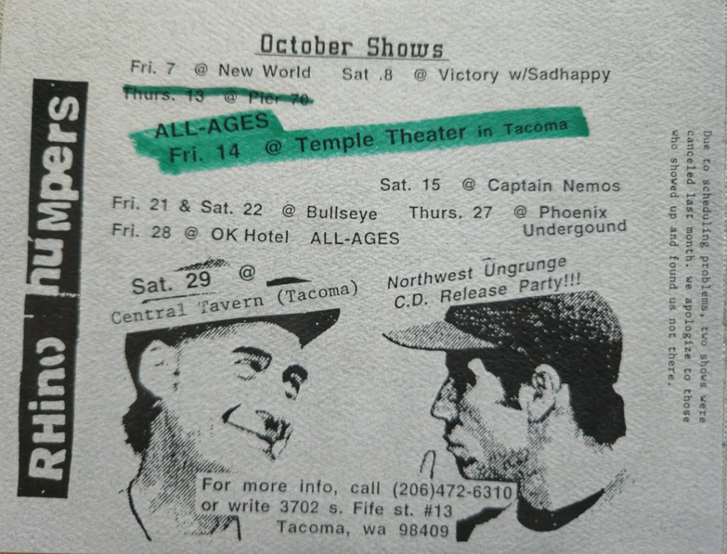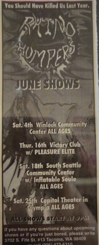 Zombicide | My Basement| San Diego, CA | 6/22/1991Flyer for my final show w/Vendeta | Red Roof Pub | Tacoma, WA | 7/30/1993Vendeta | Red Roof Pub | Tacoma, WA | 7/30/1993Rhino Humpers | June 1994 ShowsRhino Humpers | Winlock Community Center | Winlock, WA | 6/4/1994 My first full show as a Rhino HumperRhino Humpers | Victory Club | Tacoma, WA | 6/16/1994Rhino Humpers | Dreamwalker’s | Boise, ID | 7/4/1994Rhino Humpers | July 1994 ShowsRhino Humpers | July 1994 ShowsRhino Humpers | OK Hotel | Seattle, WA | 7/29/1994Rhino Humpers | September 1994Rhino Humpers | Brooklake Hall | Federal Way, WA | 9/30/1994Rhino Humpers | October 1994Rhino Humpers | Central Tavern | Tacoma, WA | 10/29/1994Rhino Humpers | Central Tavern | Tacoma, WA | 10/29/1994Rhino Humpers | Central Tavern | Tacoma, WA | 10/31/1994Rhino Humpers | Slavonian Hall | Tacoma, WA | 11/26/1994Rhino Humpers | Central Tavern | Tacoma, WA | 12/10/1994Rhino Humpers | Java Jump | Fife, WA | 12/18/1994Rhino Humpers | Central Tavern | Tacoma, WA | 12/31/1994Rhino Humpers | Giggling Goose | Olympia, WA | 1/7/1995Rhino Humpers | February 1995 Shows | 2/25/1995 was canceled.Rhino Humpers | Liberty Tavern | Aberdeen, WA | 2/3/1995Rhino Humpers | Central Tavern | Tacoma, WA | 2/4/1995Rhino Humpers | Peninsula College | Port Angeles, WA | 2/10/1995Rhino Humpers | March 1995 ShowsRhino Humpers | Spring 1995 ShowsRhino Humpers | Central Tavern | Tacoma, WA | 3/24/1995Rhino Humpers | Giggling Goose | Olympia, WA | 3/25/1995Rhino Humpers | April 1995 ShowsRhino Humpers | Java Jump | Fife, WA | 4/2/1995Rhino Humpers | Mt. Tabor Pub | Portland, OR | 4/7/1995Rhino Humpers | McCoy’s Tavern | Olympia, WA | 4/8/1995LollaPLUza 1995 T-Shirt | Pacific Lutheran University | Tacoma, WA | 4/22/1995Rhino Humpers | RKCNDY | Seattle, WA | 5/3/1995Rhino Humpers | Central Tavern | Tacoma, WA | 7/29/1995Rhino Humpers | The Moosehead | Portland, OR | 8/11/1995Rhino Humpers | Willapalooza 1995 | Raymond IWA Hall | Raymond, WA | 8/12/1995Rhino Humpers | Music in the Park Lineup Sheet | Wright Park | Tacoma, WA | 8/19/1995Rhino Humpers September 1995 Shows | 9/22, 9/28 and 9/30 were cancelled.Rhino Humpers | The Riviera | Lynnwood, WA | 9/16/1995Final Rhino Humpers Show | Central Tavern | Tacoma, WA | 9/23/1995Last show with the Wrong Notes | Central Tavern | Tacoma, WA | 2/27/1996Wrong Notes | 4th Ave Tav | Olympia, WA | 2/28/1996Rhino Humpers Reunion | Central Tavern | Tacoma, WA | August/December 1997Final Rhino Humpers Reunion Show | Central Tavern | Tacoma, WA | 12/28/1997Darkenwood | Private Party | Lynnwood, WA | 10/30/1999Reno Divorce | Acacia Park | Colorado Springs, CO | 8/4/2001Reno Divorce | August 2001 ShowsReno Divorce | The Beat Kitchen | Chicago, IL | 9/22/2001Reno Divorce | Fall 2001 TourReno Divorce | Rock N’ Roll High School | Green Bay, WI | 11/18/2001Reno Divorce | Stockage Festival @ the Starlight | Fort Collins, CO | 4/13/2002Reno Divorce | Stockage Festival @ the Starlight | Fort Collins, CO | 4/13/2002Reno Divorce | 15th St Tavern | Denver, CO | 6/22/2002Reno Divorce | Cricket on the Hill | Denver, CO | 7/26/2002Reno Divorce | Acoustic Coffee Lounge | Colorado Springs, CO | 9/14/2002Reno Divorce | 15th Street Tavern | Denver, CO | 9/20/2002Reno Divorce | The Erie Inn | Erie, CO | 9/21/2002Reno Divorce | European Tour 2002Reno Divorce | 2002 Tour PosterReno Divorce | December 2002 ShowsReno Divorce | 15th Street Tavern | Denver, CO | 12/31/2002Reno Divorce | 2003 Promo Photo | Credit: Stephanie SilsbyReno Divorce | 2003 promo photoReno Divorce | Bluebird Theater | Denver, CO | 1/26/2003Reno Divorce | H.W. Briggs | Colorado Springs, CO | 2/15/2003Reno Divorce | Cricket on the Hill | Denver, CO | 2/22/2003Reno Divorce | West Coast Tour 2003Reno Divorce | Larimer Lounge | Denver, CO | 6/26/2003Reno Divorce | Fall 2003 showsReno Divorce | Fat City | Littleton, CO | 10/31/2003Reno Divorce | Bluebird Theater | Denver, CO | 11/28/2003Reno Divorce | Larimer Lounge | Denver, CO | 12/6/2003Reno Divorce | Cheers Tavern | Arvada, CO | 1/16/2004Reno Divorce | Lion’s Lair | Denver, CO | 2/13/2004Reno Divorce | Garageland | Denver, CO | 3/5/2004Reno Divorce | Tulagi | Boulder, CO | 3/17/2004Reno Divorce | Whiskey Bill’s | Lakewood, CO | 3/27/2004Reno Divorce | Larimer Lounge | Denver, CO | 5/15/2004Reno Divorce | Gothic Theater | Denver, CO | 5/29/2004Reno Divorce | 2004 Tour PosterReno Divorce | Pre Show Party | Denver, CO | 6/21/2004Reno Divorce | Summer 2004 showsReno Divorce | 2004/2005 Tour PosterReno Divorce | 2004 Tour PosterReno Divorce | Climax Lounge | Denver, CO | 9/12/2004Reno Divorce | Bender’s Tavern | Denver, CO | 10/29/2004Reno Divorce | Bender’s Tavern | Denver, CO | 10/29/2004Reno Divorce | European Tour Poster | November 2004